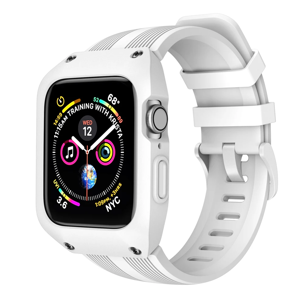 Примечание: Этот используется только для apple watch серии 4 44 мм Упаковка включает 7 штук в комплекте: 4 х винтов 1 x крышка 1 х нижний чехол 1 x жидкий силиконовый ремешок Упаковка с коробкой
