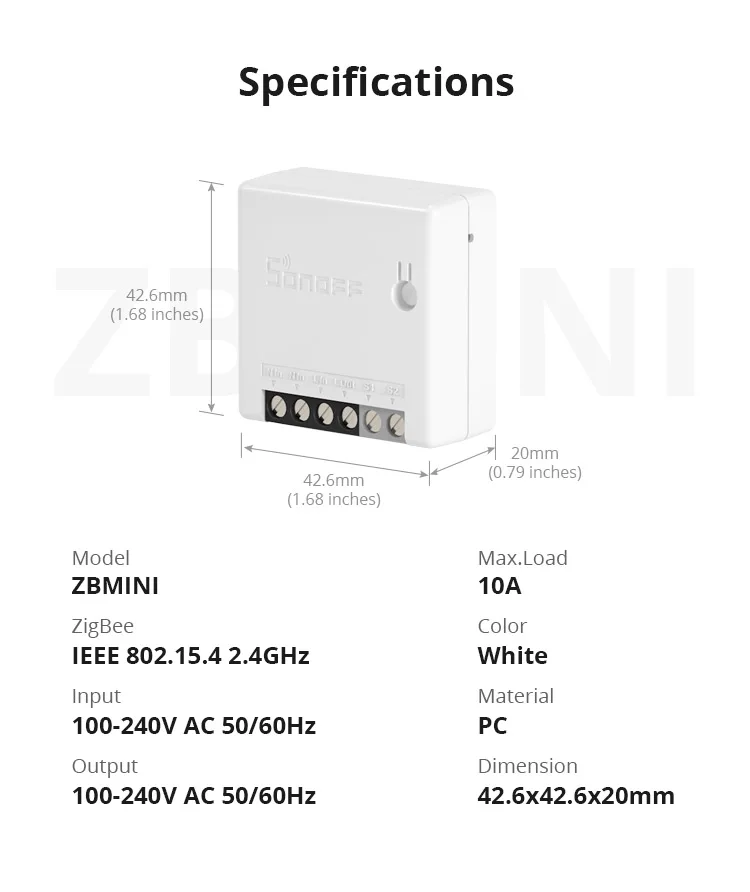 SONOFF ZBMINI-двухполосный смарт-коммутатор с поддержкой ZigBee, который совместим с различными концентраторами, включая SONOFF ZBBridge, Amazon Hub, Samsung SmartThings Hub и Philips Hue Hub. Протокол ZigBee3.0 быстро соединяет мост ZBMINI и ZigBee. ZBMINI безопаснее использовать в вашем доме, что обещано огнестойкой и огнезащитной оболочкой. Кроме того, AES-128 шифрование обеспечивает безопасность и конфиденциальность устройства данных, не беспокойтесь о конфиденциальности вашего устройства. Это может быть как маршрутизатор Zigbee, чтобы помочь передавать сигнал ZigBee для обеспечения стабильного соединения, когда несколько устройств Zigbee используются для вашего дома. Если вы заинтересованы в двухстороннем управлении, вы можете подключить однополюсный двойной переключатель для расширения внешнего соединения.