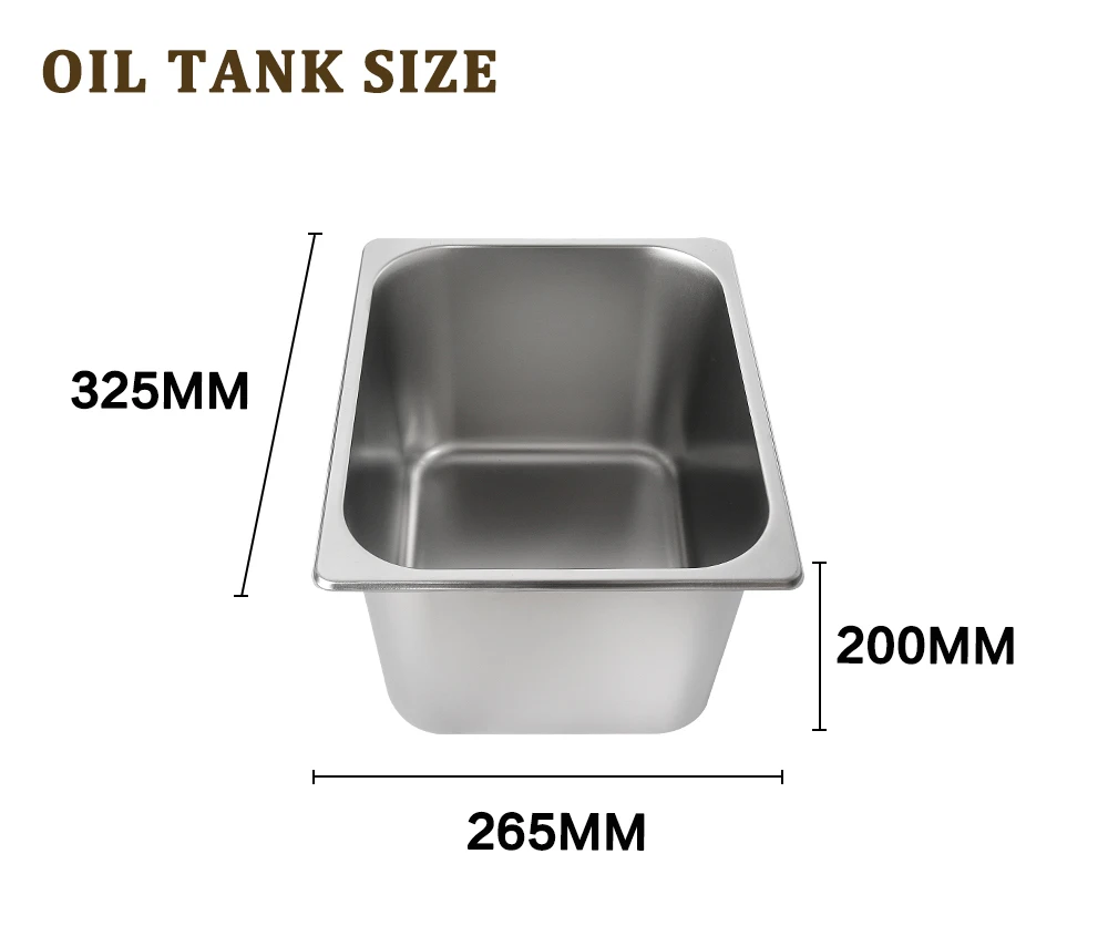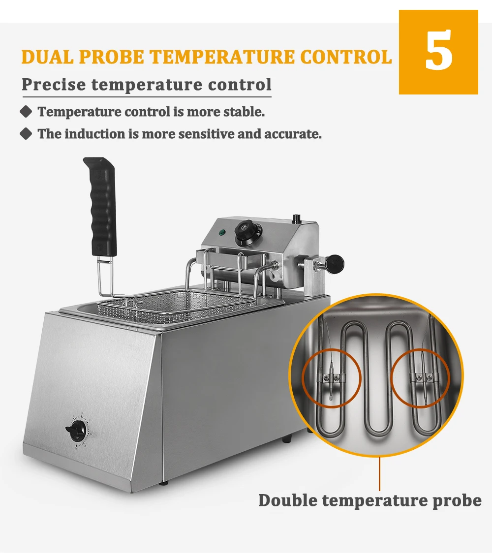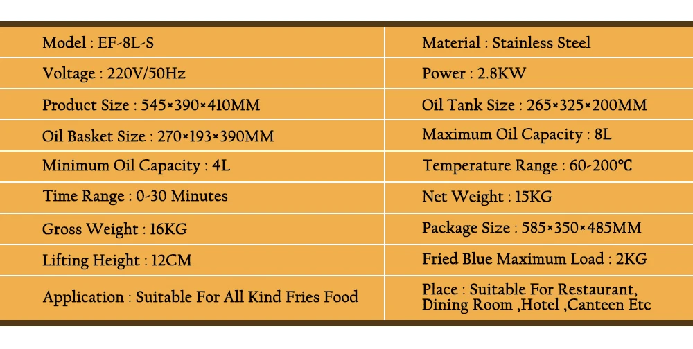Материал: нержавеющая сталь Мощность: 2800 Вт Управление таймером: 0-30 минут Контроль температуры: 50-300 градусов Емкость масла: 4-8 л Вес: 15 кг Размер: 265*590*430 мм Функция: для различных жарки пищи, картофельных чипсов, курицы, которая подходит для отеля, ресторана, столовой и т. Д.