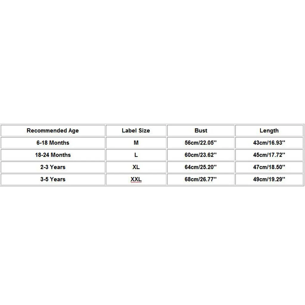 Таблица размеров: Рекомендуемый возрастРазмер этикеткиБюстДлина6-18 месяцевМ56 см/22,05''43 см/16,93''18-24 месяцевL60 см/23,62''45 см/17,72''От 2 до 3 летXL64 см/25,20''47 см/18,50''От 3 до 5 летXXL68 см/26,77''49 см/19,29'' Рекомендуемый возраст: 6-18 месяцевРазмер этикетки: MОбхват груди: 56 см/22,05 дюймаДлина: 43 см/16,93''Рекомендуемый возраст: 18-24 месяцевРазмер этикетки: LОбхват груди: 60 см/23,62 дюймаДлина: 45 см/17,72''Рекомендуемый возраст: От 2 до 3 летРазмер этикетки: XLОбхват груди: 64 см/25,20 дюймаДлина: 47 см/18,50''Рекомендуемый возраст: От 3 до 5 летРазмер этикетки: XXLОбхват груди: 68 см/26,77 дюймаДлина: 49 см/19,29''