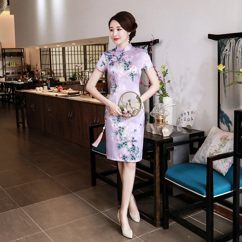 Sheng Coco короткое китайское платье для женщин красное сексуальное китайское платье Ципао ежедневное улучшение печать Ципао короткое шелковое платье с цветочным S-4XL