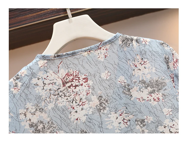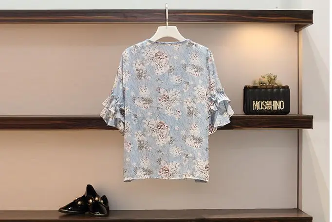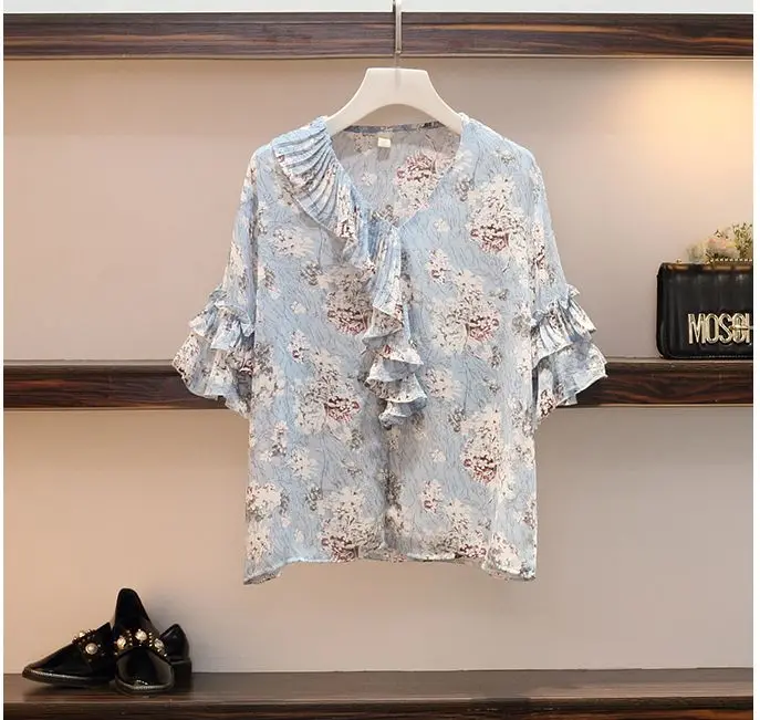 Летняя шифоновая рубашка с v-образным вырезом, оборками и цветочным рисунком, большие размеры Женский комплект 2 шт., топы + джинсовая юбка в стиле пэчворк, комплект из двух предметов, 132