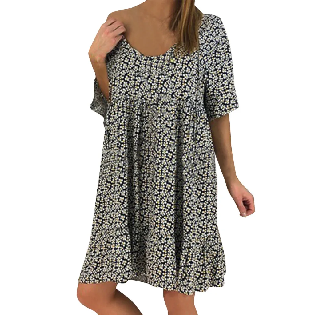 Для женщин Дамская Круглый вырез с оборками с коротким рукавом печати шифоновое платье свободного кроя