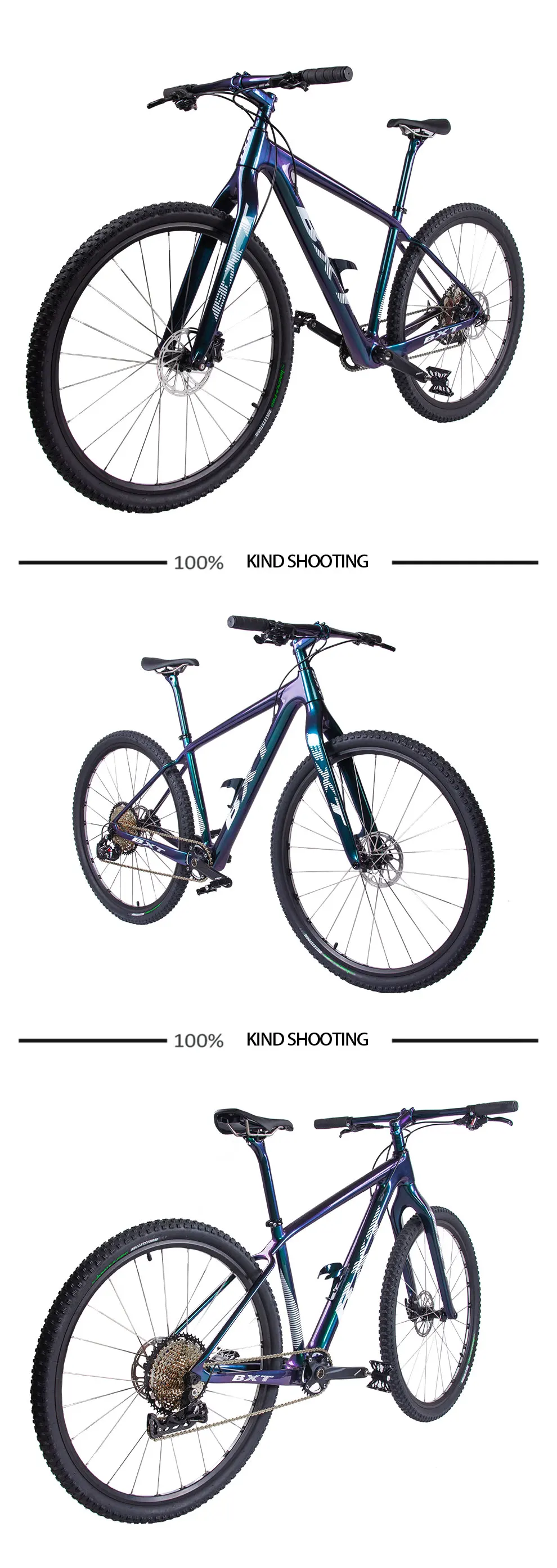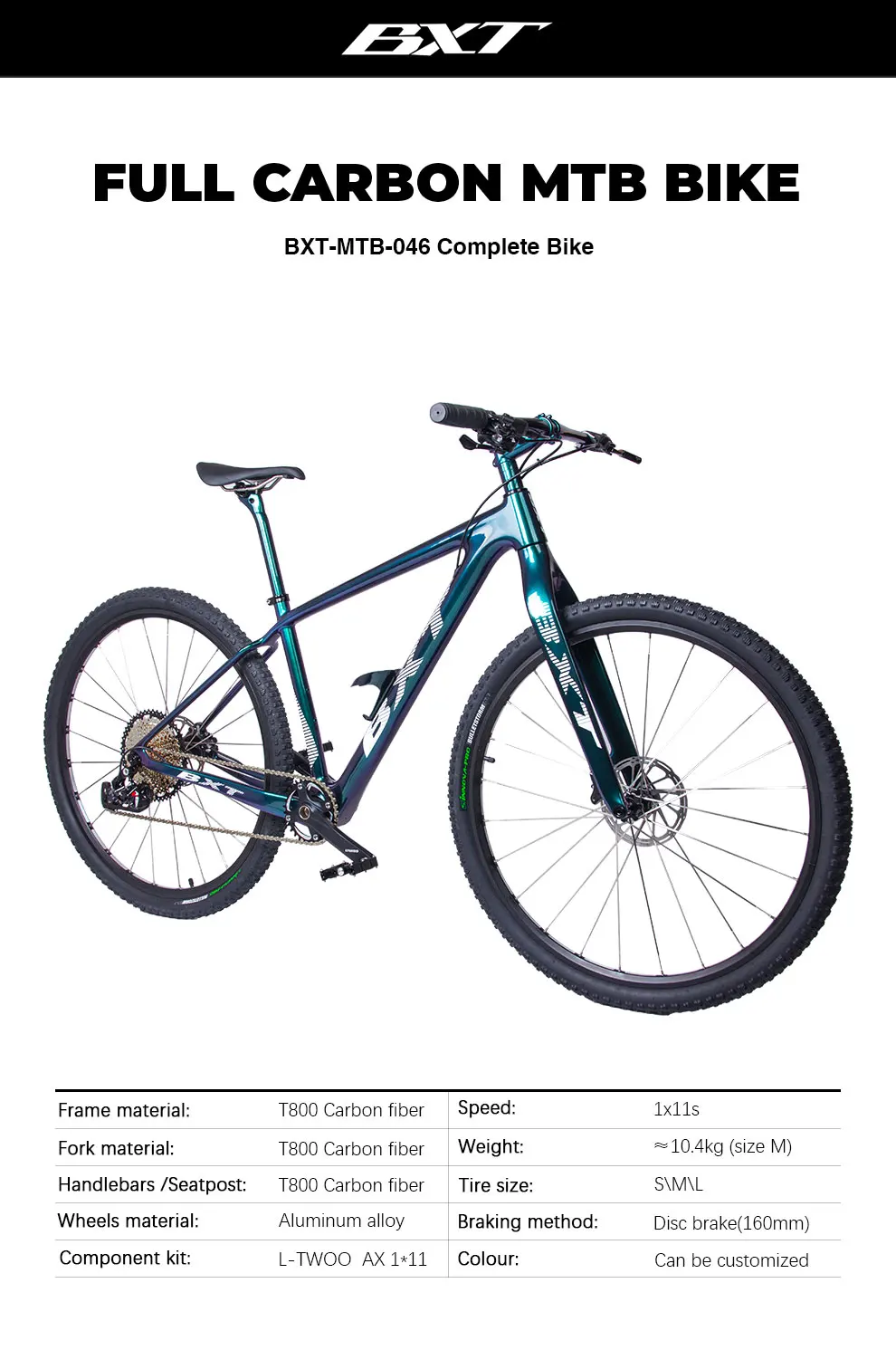 Рама: BXT карбоновая Mtb рама 29er T800 Руль кабины: углеродный руль 660 мм Велосипедная вилка: BXT углеродная вилка mtb 15 мм * 100 мм Рычаг переключения передач: 1*11 11S рычаг переключения передач Задний переключатель: 1*11 11S задний переключатель Шатуны: 1*11 11S шатуны 36T Кассетная Звездочка: 1*11 11S Кассетная Звездочка 42T Тормоз: масляный тормоз Shimano MT200 Цветочный барабан: 120 Niose 4 подшипник дискового тормоза 142 мм * 12 мм Обод горного велосипеда: Алюминиевый CNC 6106 Спицы: спицы из нержавеющей стали передние 28H задние 28H Шина: 29er * 2,1