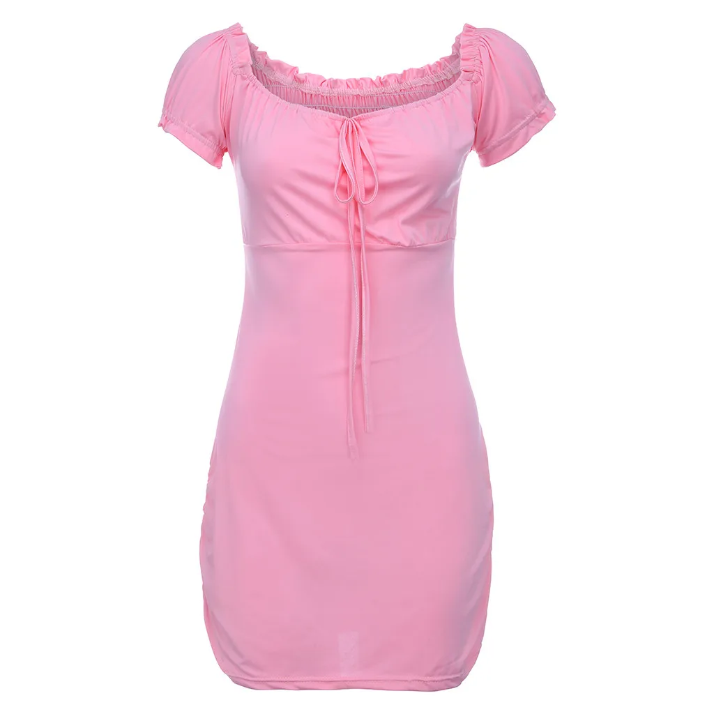 Женское летнее однотонное мини-платье с квадратным вырезом и коротким рукавом на шнуровке с рюшами