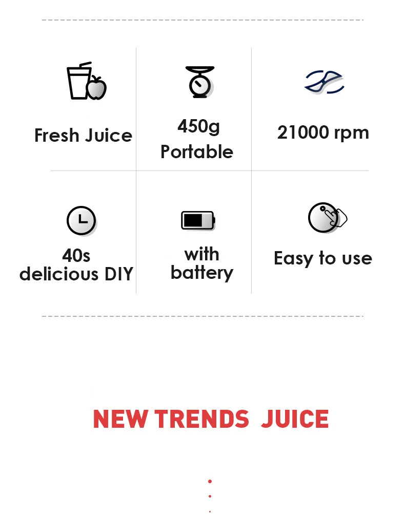 ● Лезвие из нержавеющей стали, 21000 об/мин, 40 секунд быстрого сока, может использоваться в качестве сока, молочного коктейля и т. д., сок деликатный и легко впитывается; ● Объем 300 мл, вес около 450 г, портативный, подходит для дома, работы, использования на улице; ● Аккумулятор 1400 мАч, может использоваться 10 раз при полной зарядке; ● Магнитная Зарядка, двойной щелчок для запуска, разделение чашки и крышки автоматически выключается, множественная защита безопасности; ●PCTG Материал чашки, не Бисфенол А, может быть использован с уверенностью.