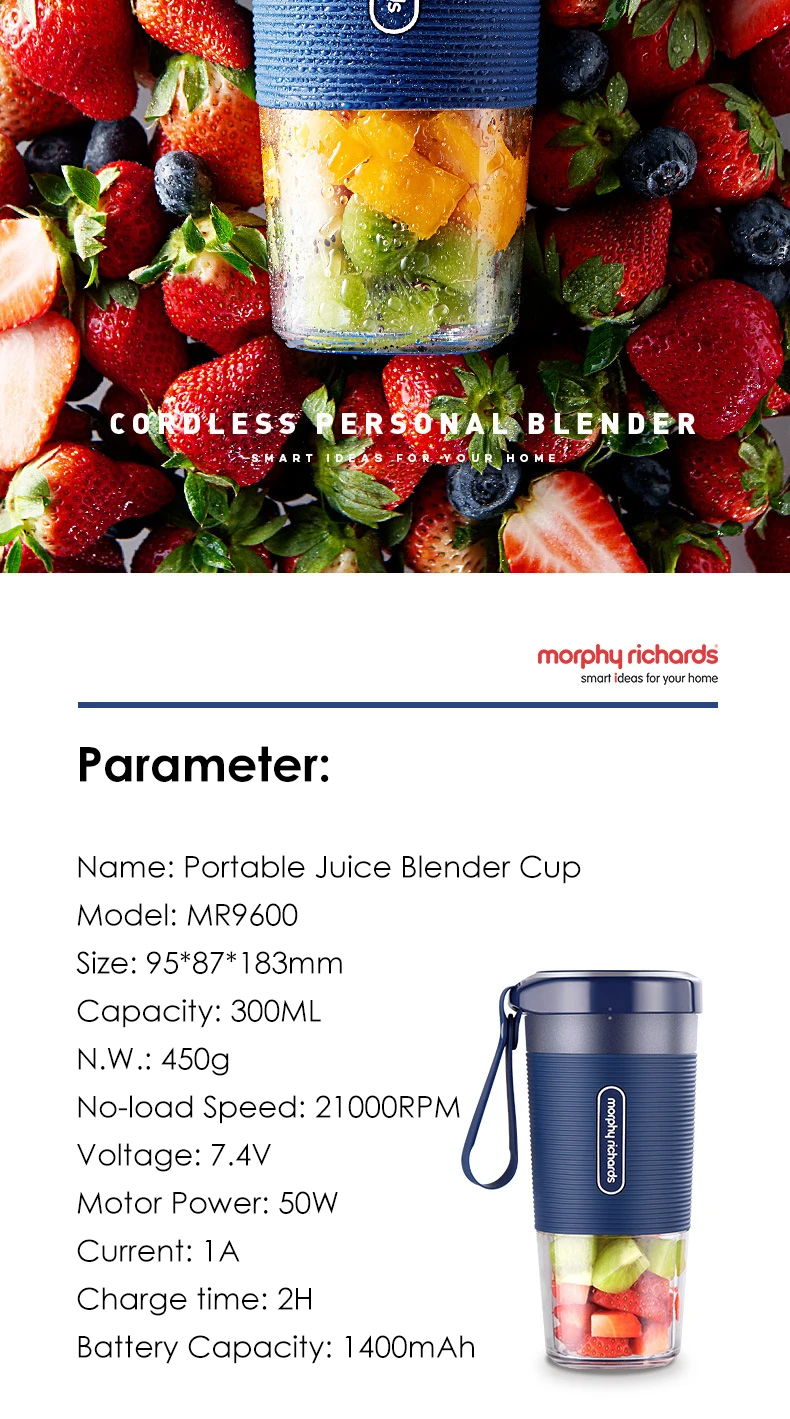 Наименование: портативная чашка блендера для сока Модель: MR9600 Размер: 95*87*183 мм Емкость: 300 мл N.W. : 450 г Скорость без нагрузки: 21000 об/мин Напряжение: 7,4 в Мощность двигателя: 50 Вт Ток: 1A Время зарядки: 2 ч Емкость аккумулятора: 1400 мАч