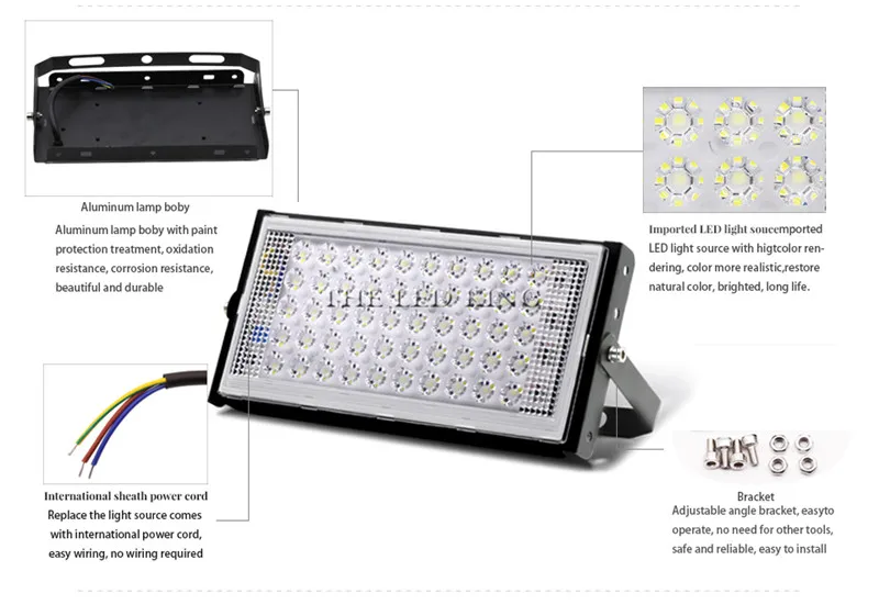 1. Экологически чистый и энергосберегающий 2. Простая установка 3. Низкое потребление, высокая яркость 4. Длительный срок службы> 50 000 часов 5. Водонепроницаемость: IP65 (не помещается в воду) 6. Одобрено CE и соответствует Rohs 7. Гарантия: 1 год Светодиодный цвет: холодный белый (6000K-6500K) Теплый белый (2700-3000k) Люмен:(10 Вт) 900LM / (20 Вт) 1800LM / (30 Вт) 2700LM / (50 Вт) 4500LM / (100 Вт) 9000LM Угол луча: 120 ° Вход: ac220в Срок службы: 50000 ч Объектив покрыт водонепроницаемым материалом Материал корпуса: алюминий Угол освещения (градусы): 120 градусов
