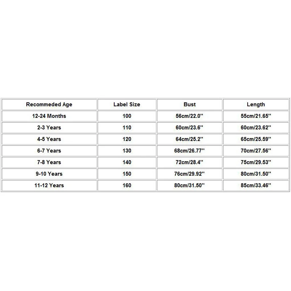Рекомендуемый возраст Размер этикетки Бюст Длина 12-24 месяца 100 56 см/22,0'' 55 см/21,65'' От 2 до 3 лет 110 60 см/23,6'' 60 см/23,62'' От 4 до 5 лет 120 64 см/25,2'' 65 см/25,59'' От 6 до 7 лет 130 68 см/26,77'' 70 см/27,56'' От 7 до 8 лет 140 72 см/28,4'' 75 см/29,53'' От 9 до 10 лет 150 76 см/29,92'' 80 см/31,50'' 11-12 лет 160 80 см/31,50'' 85 см/33,46''