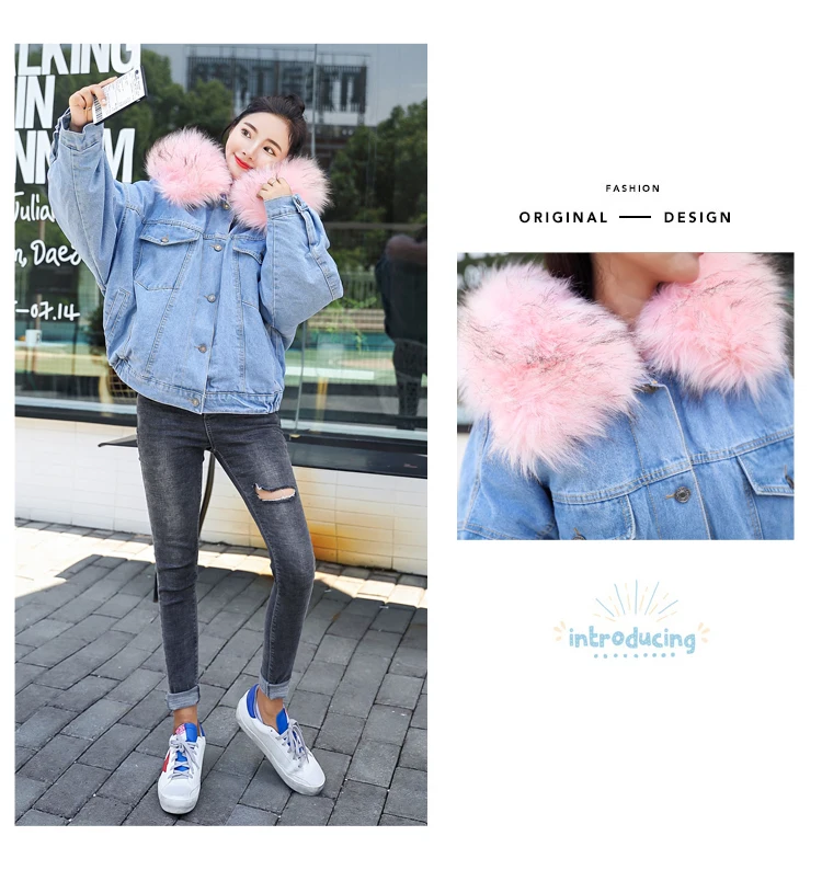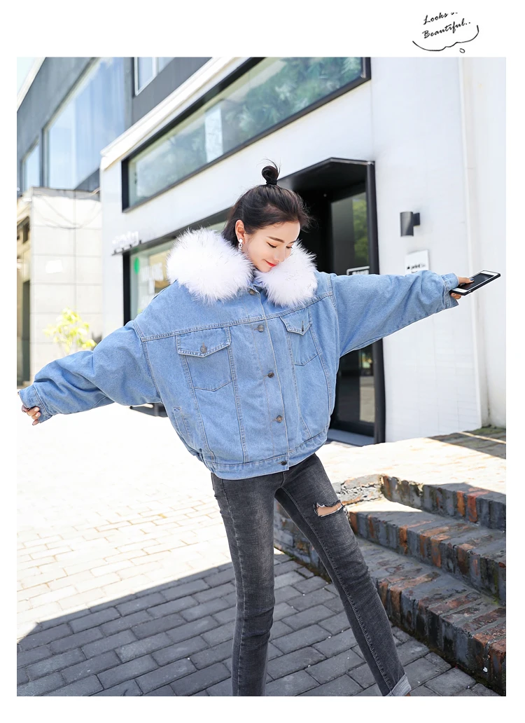Женская куртка с большим меховым капюшоном BUENOS, теплая джинсовая куртка из плотного бархата на осень и зиму, 2019
