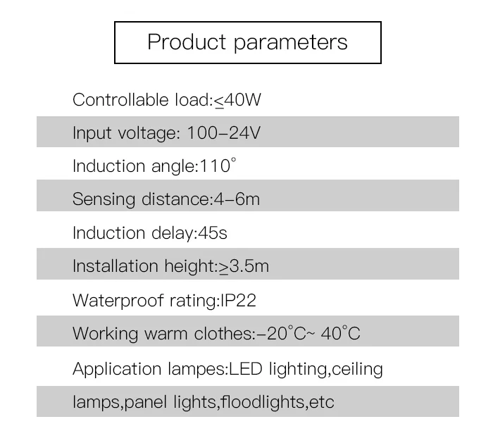 Параметры: Тип: инфракрасный датчик движения из PIR переключатель Материал: ПВХ Цвет: белый Рабочее напряжение: 100-240 В Мощность нагрузки: <= 40 Вт Рабочая температура: -10 ℃ -+ 40 ℃ Время задержки: 40s Управление светильник: >= 3 люкс Угол индукции: 110 градусов Индукционное расстояние: 4-6 м В режиме ожидания потребеление энергии: менее 0,1 w Применение: светодиодный светильник, светодиодный светильник, потолочный светильник, энергосберегающая лампа, люминесцентная лампа.