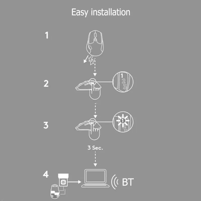 Сопряжение мыши с 3 компьютерами, нажмите на удобную кнопку под большим пальцем, чтобы легко переключиться между компьютерами. 3 номера освещения позволяют вам в любое время узнать, какое устройство подключено.