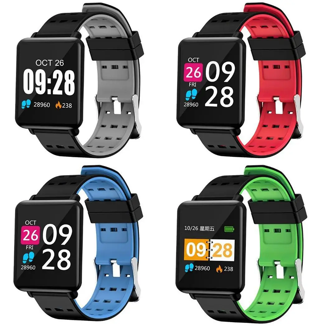Band Material: TPU Material: Silicone Color: Black Red, Pink, Black Gray, Black Green, Blue, Black Blue, Black Package Size: 12 x 8 x 3cm/4.7 x 3.1 x 1.2inch Screen Size: 1.44inch Product Type: Smart Bracelet Platform Support: Android 4.4 or Above ,iOS 8.0 or Above Memory: 2MB Battery: 180mAh Polymer Lithium Battery Closure: Buckle Shape: Square Charging Type: USB 2.0 Waterproof: IP67 Control: Touch Gender: Unisex Quantity: 1pcs Features: Blood pressure oxygen and heart rate monitor. Real-time monitoring of movement state steps, calories, distance, etc Suitable for casual wear. Package Content: 1 x Smart Bracelet, 1 x Manual Note: Due to the difference between different monitors, the picture may not reflect the actual color of the item.