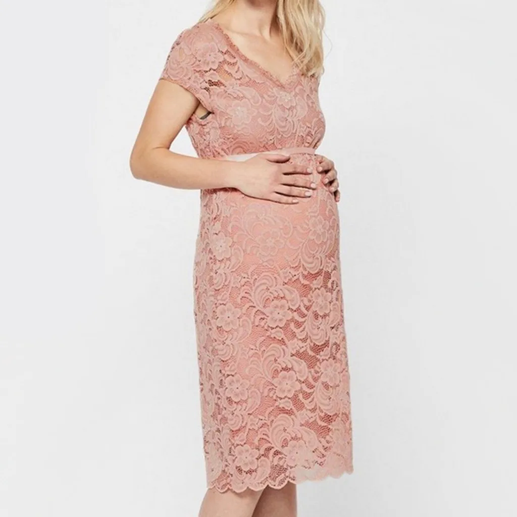 Сексуальное платье для беременных, кружевное платье для беременных, однотонное платье с коротким рукавом и круглым вырезом