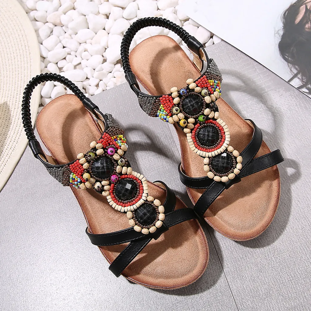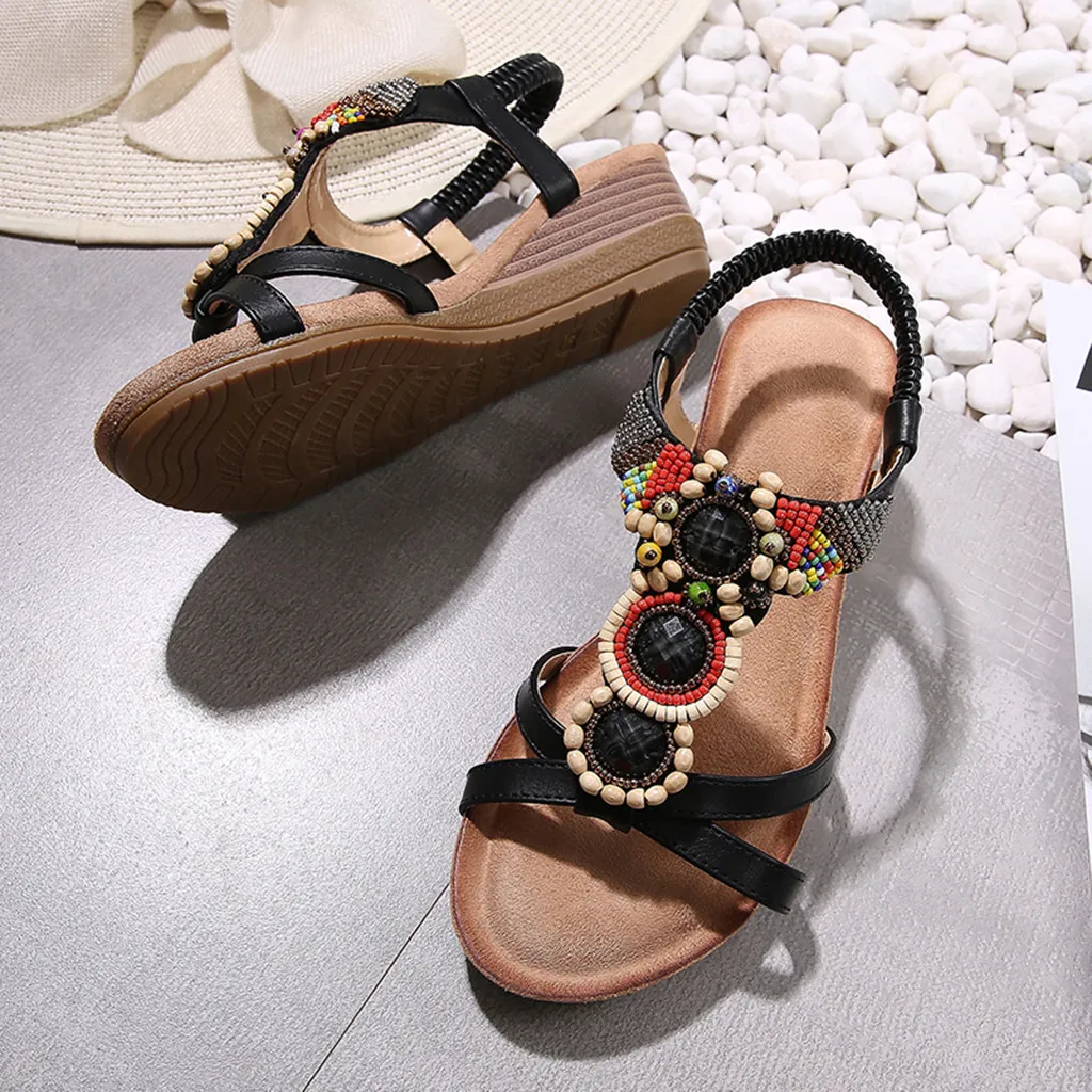 Женская повседневная обувь на танкетке, украшенная бусинами; пляжная обувь в богемном стиле с эластичным ремешком; сандалии