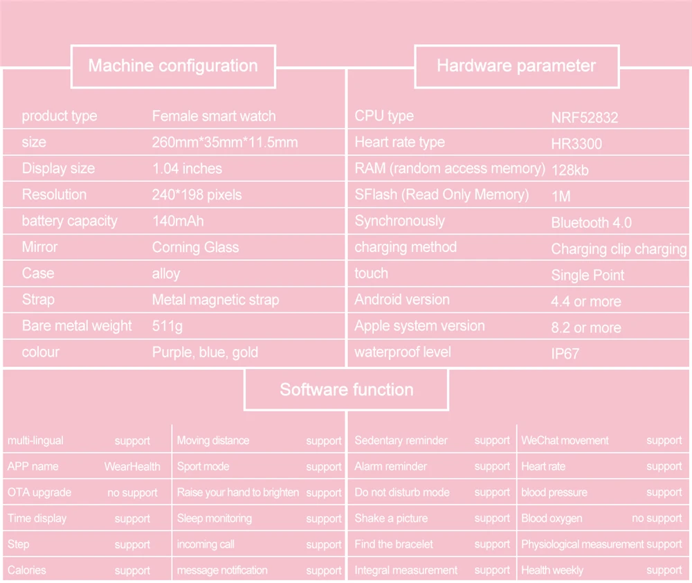 * Дополнительные функции: Отображение времени/часов, шаг, калории, расстояние, сон, камера, мониторинг сна (время сна, качество сна, задержка в ожидании), поиск браслета, будильник/лекарство/встреча/напоминание о сидячем положении/напитке, камера дистанционного управления (встряхните, чтобы сделать фотографии).