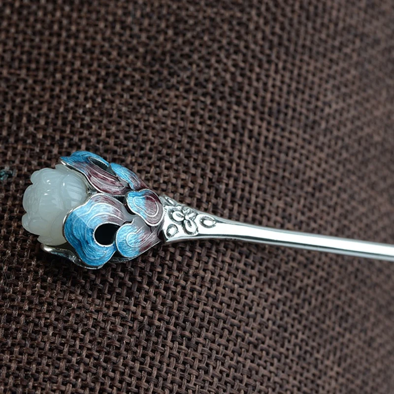 Нефритовая инкрустация Cloisonne, тайская Серебряная палочка для волос, винтажная эмалированная серебряная шпилька в китайском стиле, заколка для волос с цветком лотоса, украшения для волос, аксессуары для волос 16x7xT0.5cm WIGO1388