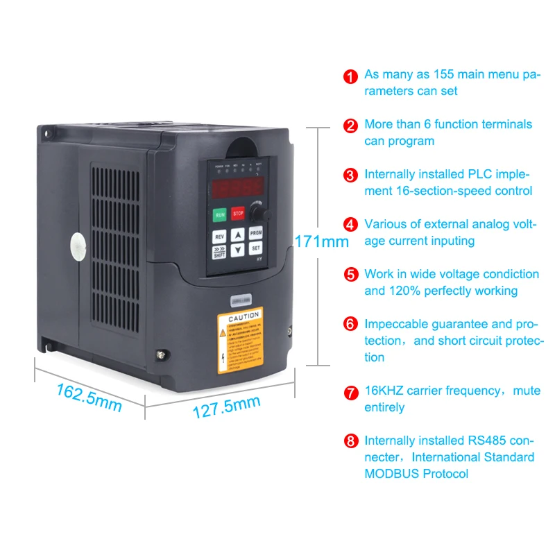 Характеристики продукта:PID контроль; Улучшенная арифметика PID с замкнутым циклом, быстрая скорость отклика и высокая пригодность;Простая функция PLC может реализовывать 16 ног скорости и функции управления инвертором;RS485 порт связи, принимающий стандартный международный MODBUS Главного управления цепи;С чрезвычайно сильной защитой от помехНизкая Выходная ratting torque0.5гц-150%, низкая скорость работы;Переноска регулируется на 16 кГц, полностью беззвучная рабочая среда;Широкая рабочая зона напряжения, нормальная работа в 304-456 в;Автоматическая регулировка напряжения (AVR) техника, для обеспечения мощности нагрузки инвертора;Различные методы управления синхронизацией и несинхронизацией, динамически реализуют быстрый запуск без изменения тормозов;С идеальной защитой от ошибок и защитой от короткого замыкания;