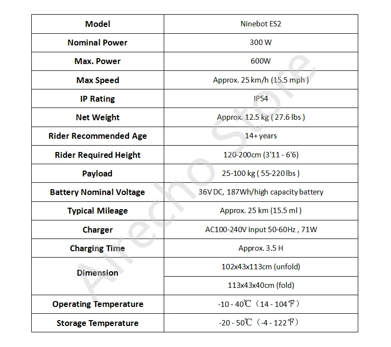 Модель: ES2 Номинальная мощность: 300 Вт Макс. Мощность: 600 Вт Максимальная скорость: прибл. 25 км/ч (15,5 миль в час) IP Рейтинг: IP54 Вес нетто: прибл. 12,5 кг (27,6 фунтов) Рекомендуемый возраст: 14 + лет Требуемая высота: 120-200 см (3'11 - 6'6) Полезная нагрузка: 25-100 кг (55-220 фунтов) Номинальное напряжение батареи: 36 В постоянного тока, 187Wh/аккумулятор большой емкости Стандартный Пробег: прибл. 25 км (15,5 мл) Зарядное устройство: AC100-240V вход 50-60 Гц, 71 Вт Время зарядки: прибл. 3,5 H Размер: 102x43x113 см 113x43x40 см (складывается) Рабочая температура: -10 - 40 ℃(14 - 104 ℃) Температура хранения: -20 - 50 ℃(-4 - 122 ℃)