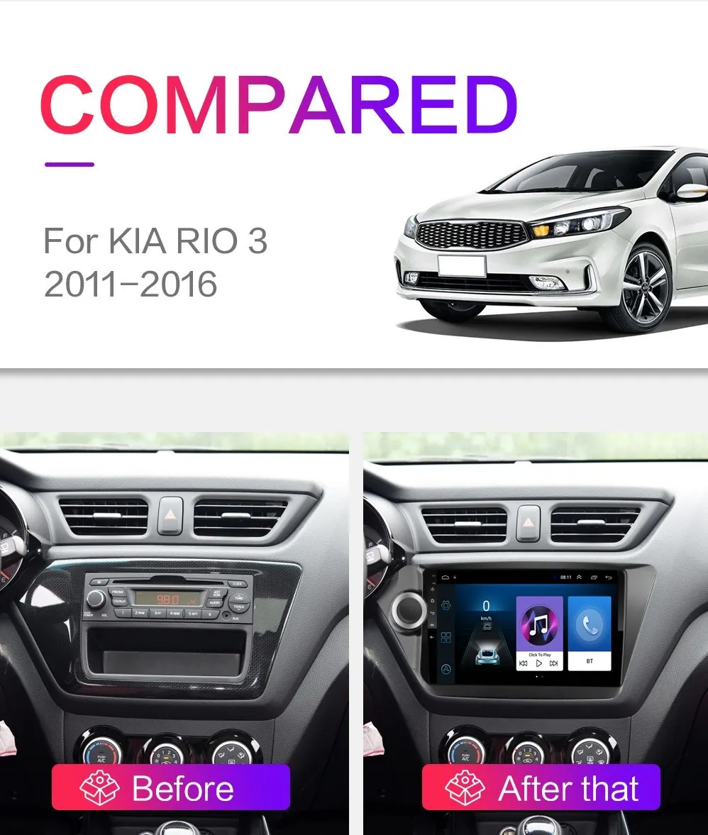 Для KIA RIO 4 (2017), KIA RIO 3 (2011-2016) 1, 4-х ядерный конфигурация включает в себя (Оперативная память + Встроенная память): 1 Гб + 16 ГБ/2 ГБ + 16 ГБ/2G + 32G / 4G-SIM-2G + 32G [дополнительно] 2, 8-ядерный конфигурация включает в себя (Оперативная память + Встроенная память): 7260L-2G + 32G / 7260L-4G + 64G \ 5760-SIM-2G + 32G \ 5760-SIM-4G + 64G [дополнительно] 3, 4-х ядерный содержит: версия: Android 6,0 Четырехъядерный процессор MTK8227 / Cortex-A7 Поддержка автомобиля logo5;Sfactory пароль: 8888 Разрешение: HD 2.5D,1024*600; Не поддерживает функцию AM, функцию RDS; Обычная посылка WiFi поддерживает функцию видеовыхода Посылка версии 4G-SIM-DSP не поддерживает функцию видеовыхода 4, 8-Core содержат: версия: Android 9,0 Восемь ядер: CPU Quad core и GPU Quad core соответственно Поддержка автомобиля logo5;Sfactory пароль: 8888; Разрешение: HD 2.5D,1024*600; Версия 7260L-WIFI поддерживает функции DSP, IPS, AM, RDS; Не поддерживает видеовыход Версия 5760-4G-SIM-WIFI поддерживает функции DSP, IPS, AM, RDS, Carplay; Не поддерживает видеовыход 5. Операционная система Android может установить приложение Google Play store Skype Facebook youTube Twitter и т. Д. 6. Поддержка: радиостанция, Bluetooth Вызов, Bluetooth музыка, управление рулевым колесом, встроенный WiFi, MP3, видео музыка (MPG, AVI), навигация, видеовыход, зеркальная связь, USB 4G LTE WIFI ключ и другие функции Поддержка OBD (опционально) Поддержка DAB + (опционально)