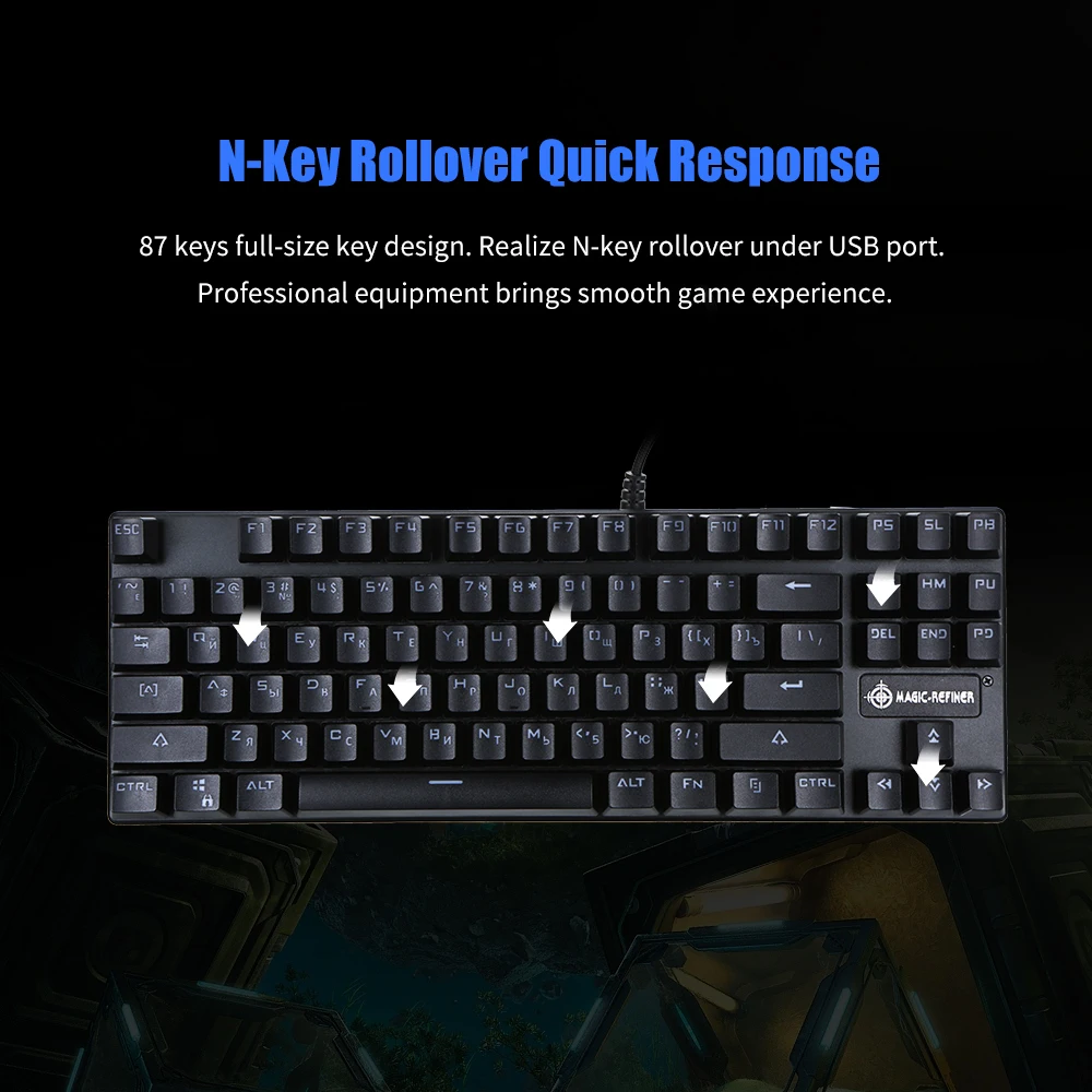 Механическая клавиатура MAGIC-REFINER предназначена для игрового плеера. 87 N-key ключ для переворачивания дает вам превосходный игровой опыт. Механический синий переключатель обеспечивает быструю реакцию, и позволяет вам наслаждаться плавной игрой.