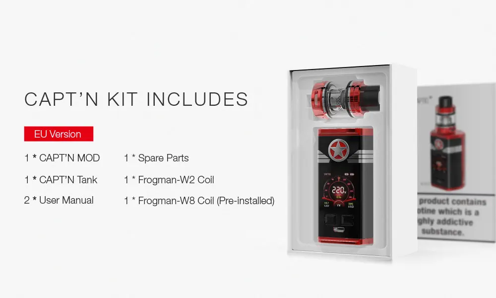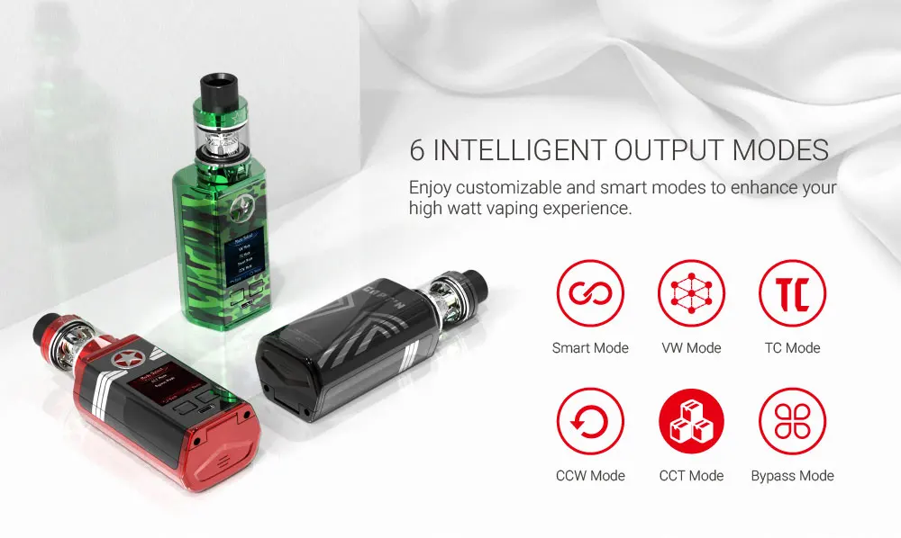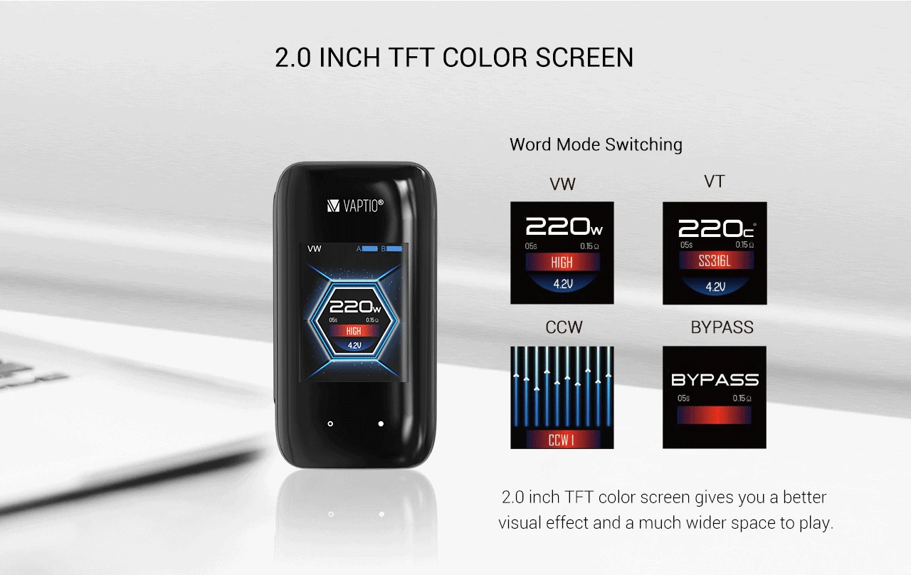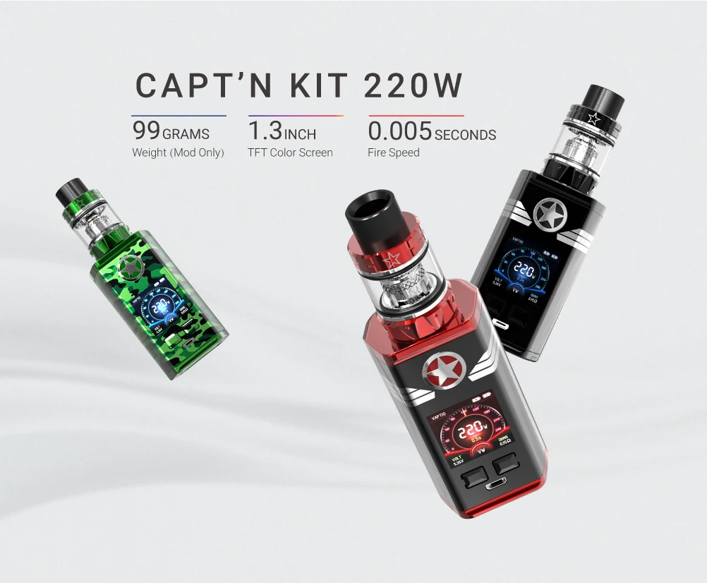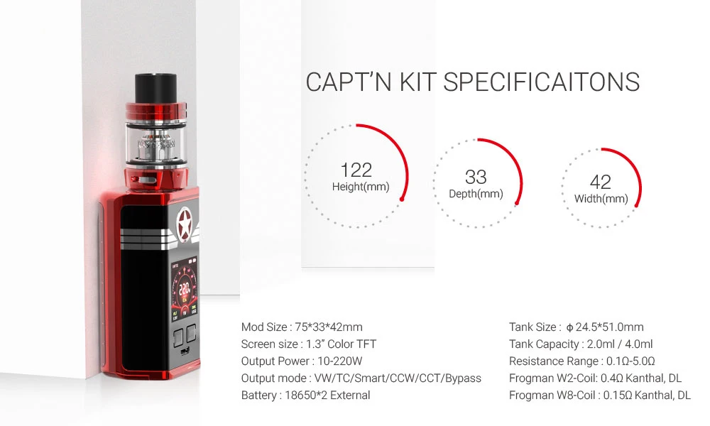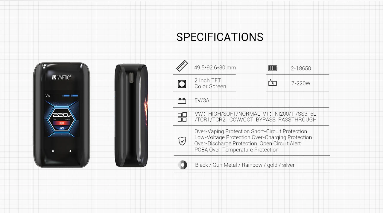 Аккумулятор: внешний 2*18650 (не входит в комплект) Диапазон сопротивления: 0,15-3,0 Ом Экран дисплея: 1,3 дюйма, цветной, TFT Размер бака: 24,5*51 мм Размер мода: 75*33*42 мм Выходная мощность: 10-220 Вт Рекомендуемая мощность: 50-100 Вт