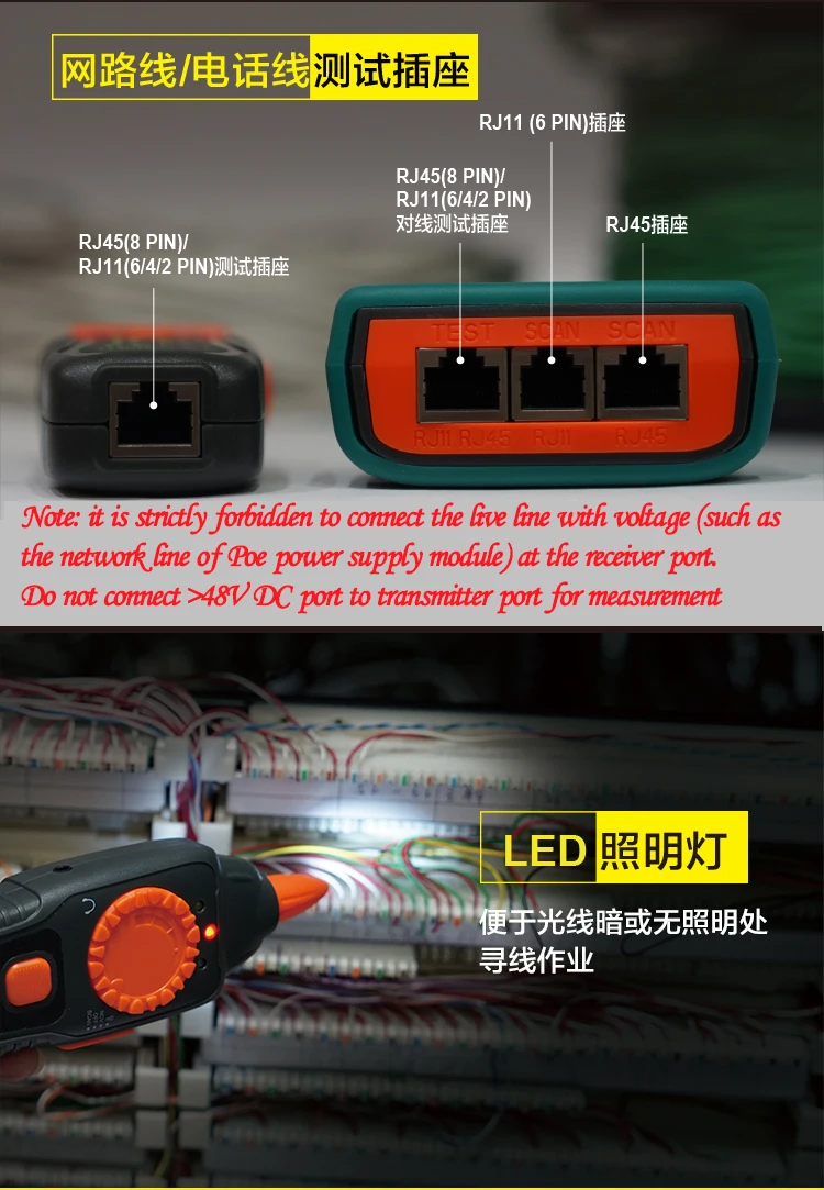 Поиск линии Сетевой кабель 8p вставляется в обычное отверстие 8p / 6p, которое может быть Протестировано с помощью прямого электрического сигнала. Но зажим аллигатора должен быть заземлен одновременно, в противном случае он не может быть протестирован. Линия разделения дихотомии 6p поиск телефонной линии Вставьте специальное отверстие 6p или тест с зажимом аллигатора 6p