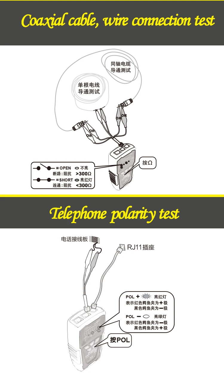 Коаксиальный кабель, проверка подключения провода Подключите провод с зажимом типа «крокодил», подключите один конец линии с черным зажимом типа «Аллигатор», подключите другой конец с красным зажимом типа «Аллигатор», нажмите клавишу Ω, И судите о вкл/выкл и коротком замыкании линии в соответствии с открытой схемой на индикаторном светильник. Проверка полярности телефона Подключите провод с зажимом типа «крокодил», соответственно Зажмите телефонную линию для проверки, нажмите клавишу pol и оцените положительную и отрицательную полярность линии через цвет Pol + / -лампы.