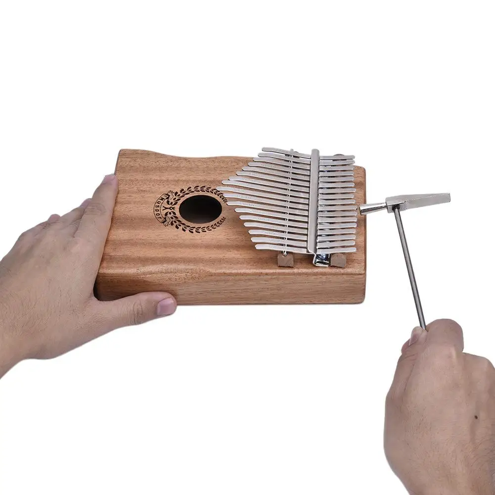 Металлические ключи Muspor Kalimba установлены на ящик из твердой древесины, который работает как резонансная камера.