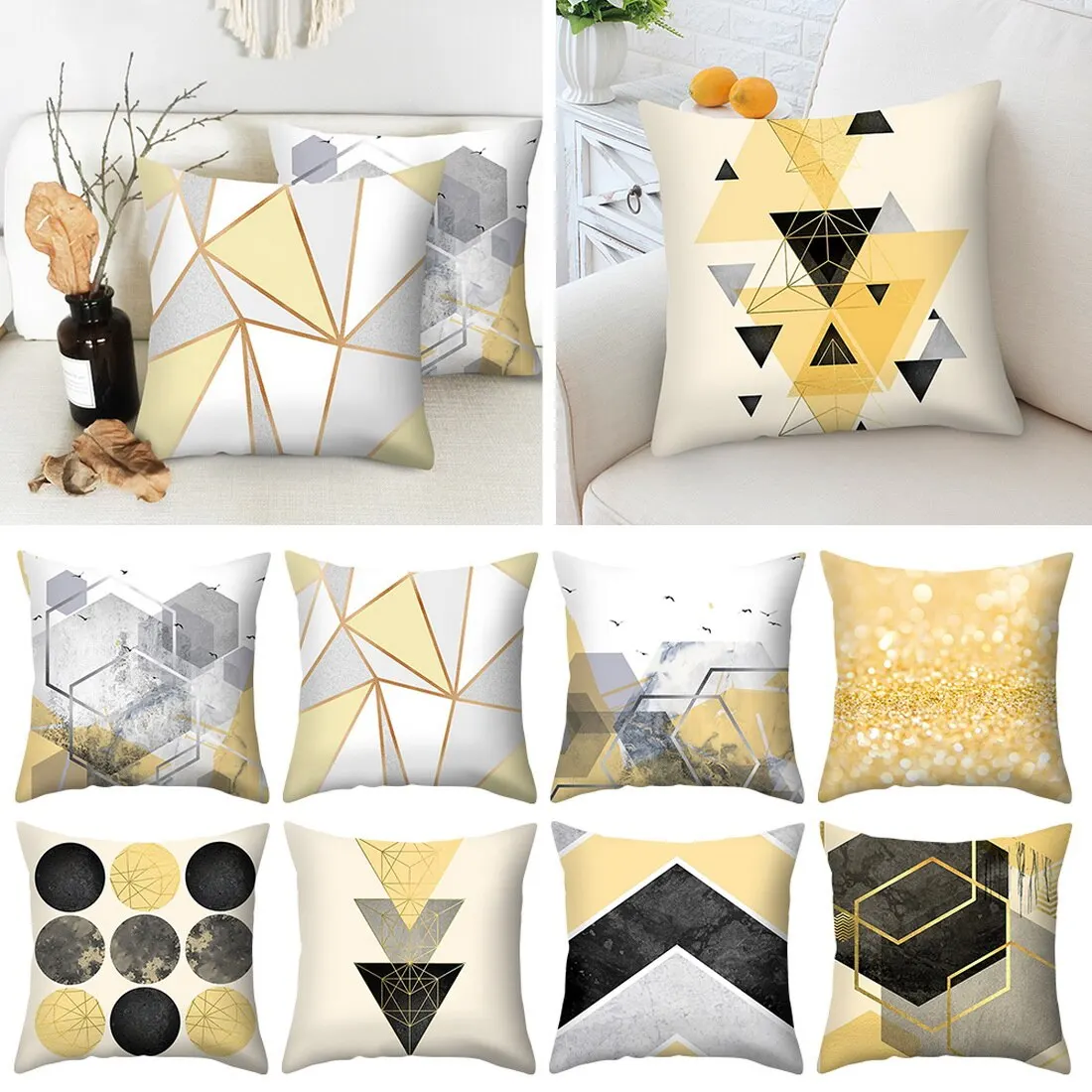 Характеристика Наволочка для подушки с желтым принтом для домашнего декора, рисунок только с одной стороны, с другой стороны пустой, предоставляя вам возможность сделать своими руками Модный чехол для подушки с геометрическим принтом, мягкий и удобный для использования Наволочка из прочной полиэфирной ткани и уникальный дизайн создают стильный комфорт на диване, диване, полу, скамейке или кровати