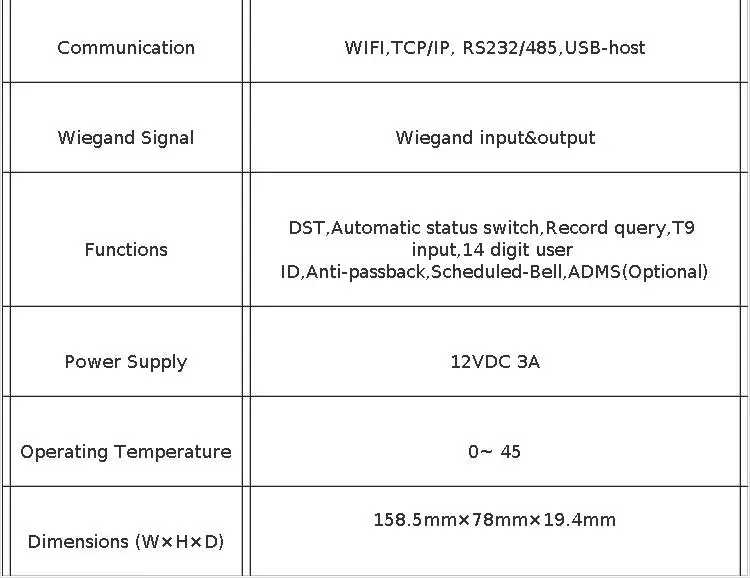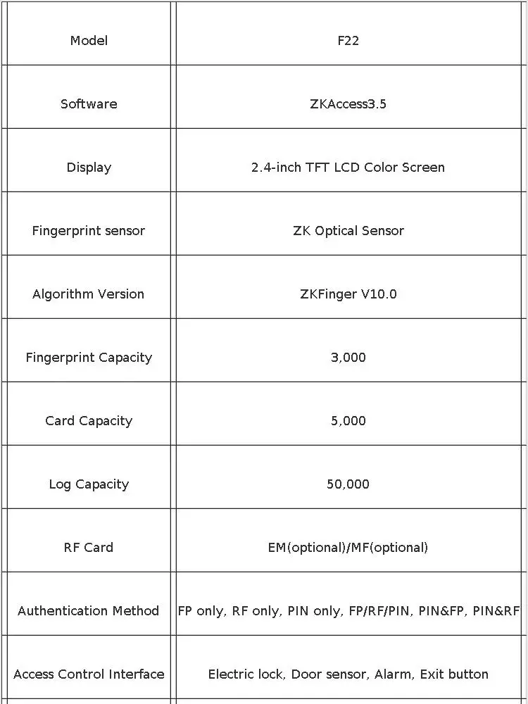 F22 обеспечивает превосходное прикосновение к сенсорной клавиатуре и обеспечивает гибкость для самостоятельной установки или с любой третьей вечерние панелью управления доступом, которая поддерживает стандартный сигнал wiegand. TCP/IP, RS485 и Wi-Fi также доступны, что устройство может использоваться в различных сетях.