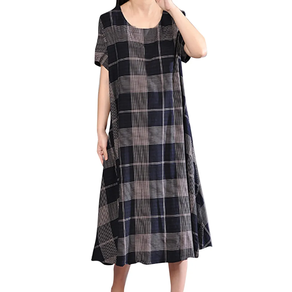 1. Особенности: модная одежда; модная женская одежда; круглый вырез; короткий рукав; принт в клетку; свободное платье.