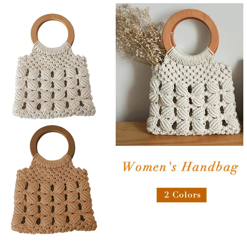 1. Hansenne литературный ретро стиль, тканая сумка, круглая деревянная ручка, сумочка, ручная работа, хлопковое плетение веревки, полый тканый мешок;