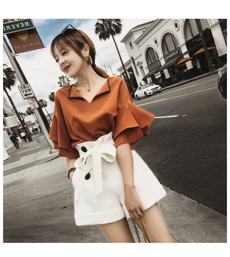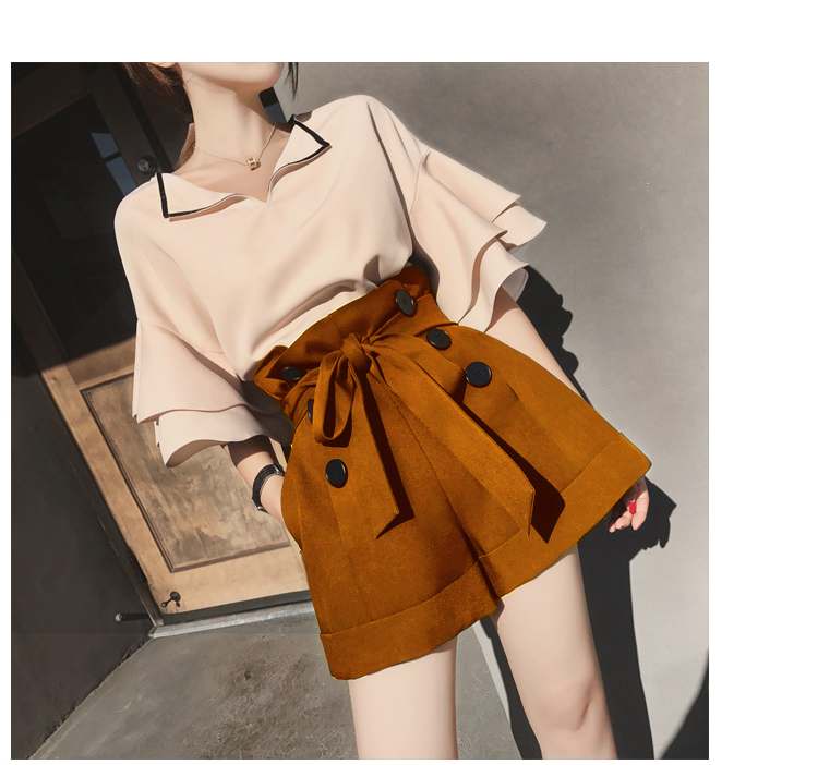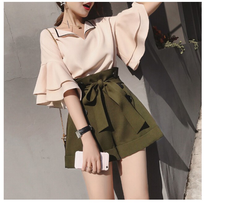 Двубортный с поясом, высокая талия, свободные широкие брюки + топ с расклешенными оборками на рукавах