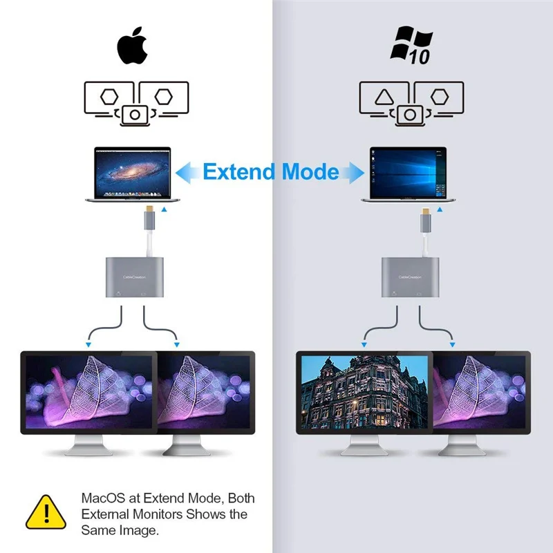 Описание продукта: USB C на двойной HDMI Этот адаптер построен с решением [Альтернативный режим DisplayPort] Адаптер USB-C-HDMI совместим со следующим устройством: * Macbook Air 2018 * IMac 2017 / iMac Pro 2017 * MacBook Pro 2017 и 2016 * MacBook 2016 и 2015 * Новая Chromebook Pixel * Dell XPS 15 и 13 и 12 * HP Spectre x360 13 и 15 дюймов * Asus Zen AIO все в одном ПК * Surface Book 2 Если вашего устройства нет в списке, пожалуйста, не стесняйтесь связаться с нами. Важные Примечания: 1. Перед покупкой убедитесь, что ваш компьютер поддерживает «Альтернативный режим DisplayPort». 2.⭐Для системы MacOS он не будет поддерживать режим расширения, два монитора HDMI покажут то же изображение. Как показано на третьей картинке.⭐Если вы хотите использовать режим расширения в системе MacOS, вы можете использовать систему Win10 или вы можете рассмотреть продукт ASIN B07799WBKW (CD0502) и ASIN B019Q652AG (CD0101). Пожалуйста, имейте в виду, что CD0502 совместим только с ноутбуком Thunderbolt 3, он также не совместим с macbook12 ''из-за того, что этот ноутбук USB-C Gen 1 не Thunderbolt. 3. Для того, чтобы наслаждаться высоким разрешением 4K, пожалуйста, убедитесь, что используете кабель HDMI 2,0. 4. Поддерживает разрешение до 4k @ 30 Гц, но мы рекомендуем вам убедиться, что ваш монитор/телевизор может поставить соответствующий выход. 5. Если разрешение вашего ноутбука выше, чем у внешнего монитора. Для windows: меню Windows-> Настройка-> отображение-> дополнительные настройки дисплея, Установите разрешение ноутбука так же, как и разрешение внешнего монитора. Для MacOS: слева-верхний значок Apple-> системные настройки-> дисплеи-> зеркальные дисплеи. Затем ваш монитор HDMI будет отображать ваш Mac. Однако здесь у вас есть два варианта. Один из них-«оптимизация» Вашего встроенного дисплея Retina, другой-«оптимизация для» вашего монитора HDMI. Вы можете выбрать тот, который вам нравится. 6. Для ноутбука Windows system, если внешний монитор не может работать, пожалуйста, Обновите BIOS и драйвер графической карты с официального сайта ноутбука.