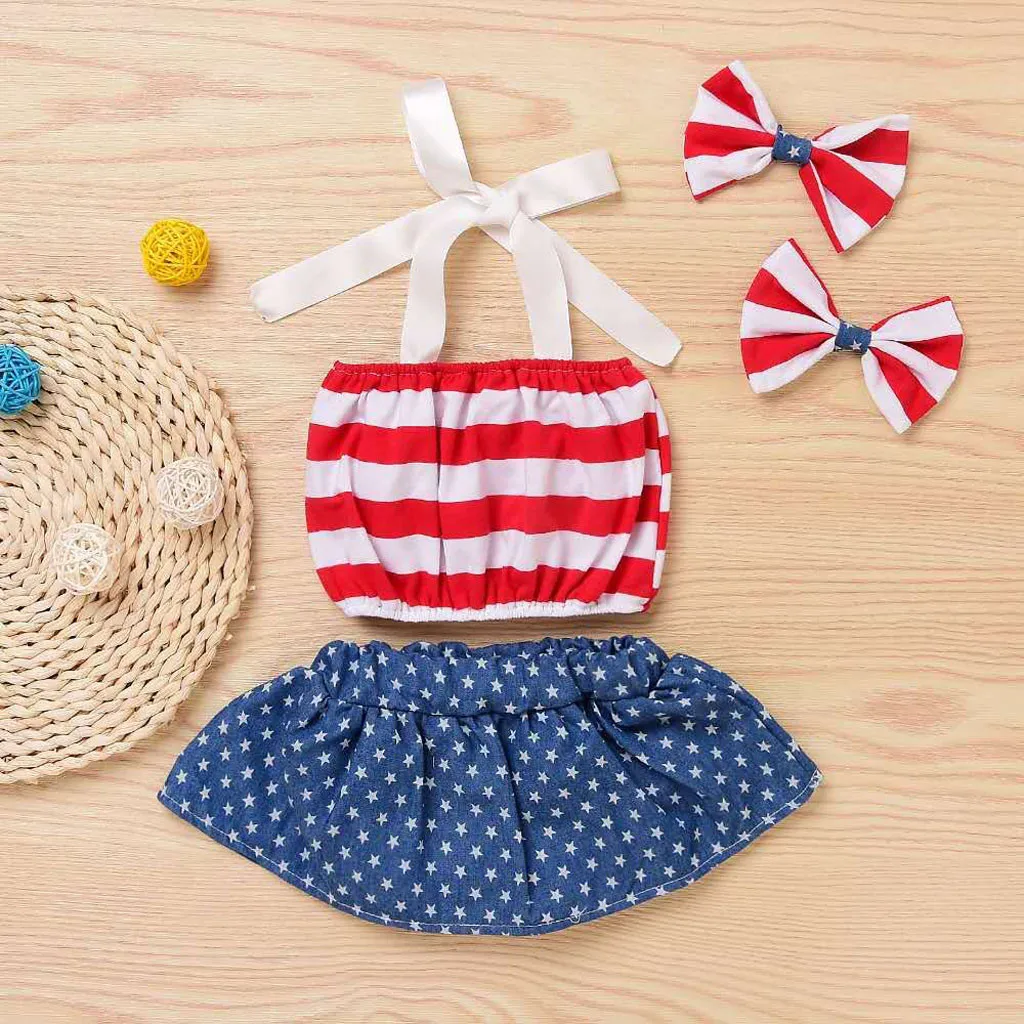 Патриотические полосатые топы с бантом для малышей 4 июля + повязка на голову