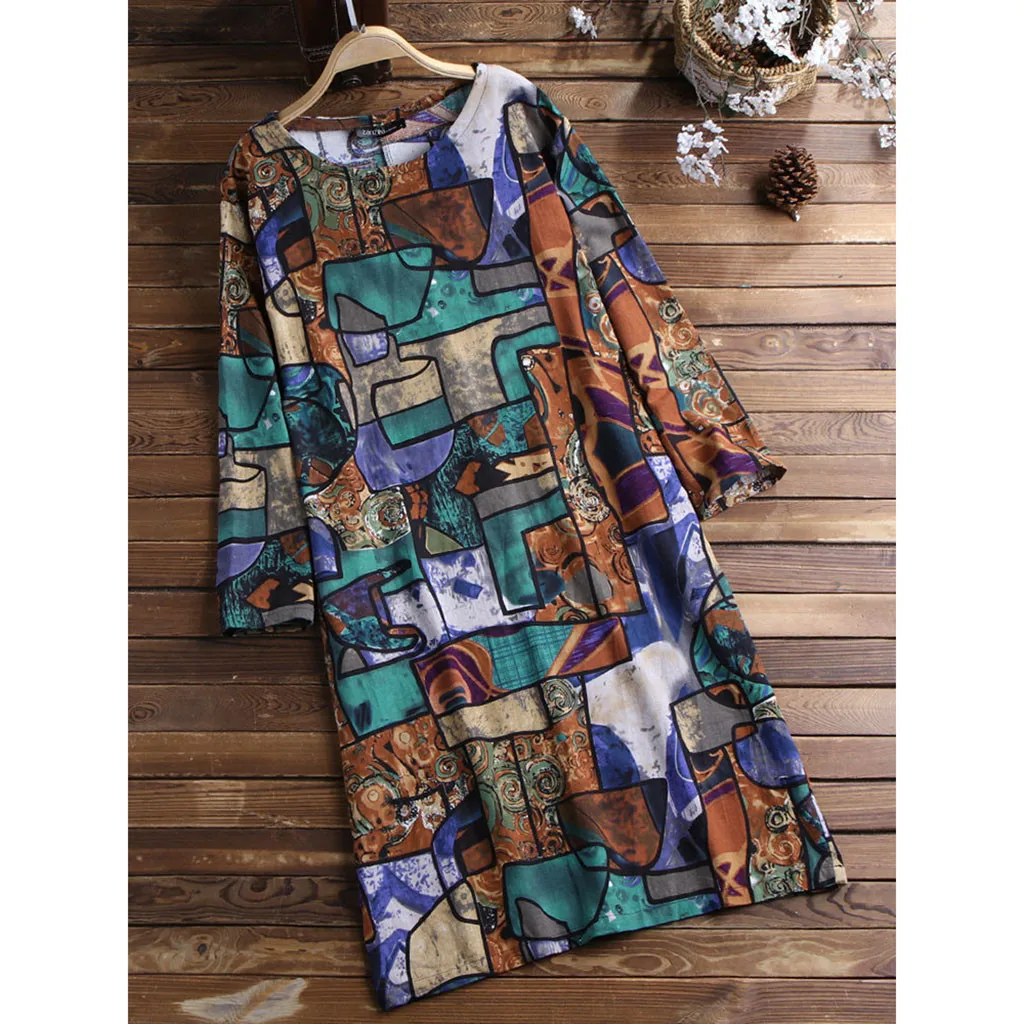 Женское летнее Хлопковое платье с принтом и длинными рукавами, свободное платье большого размера