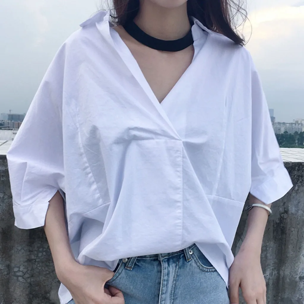 Модная женская Свободная рубашка с отворотами с коротким рукавом, v-образным вырезом, Свободная блузка