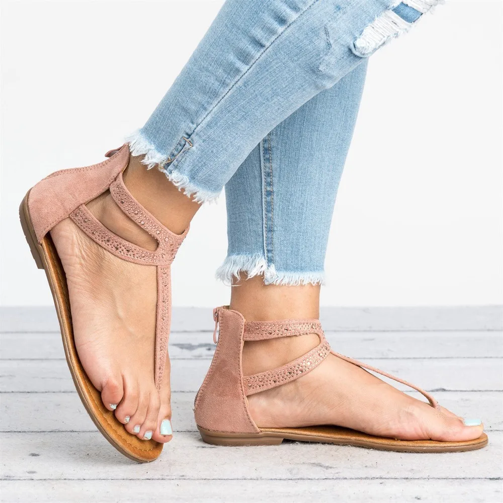 Женские сандалии-гладиаторы на молнии со стразами; вьетнамки на плоской подошве; пляжные сандалии; обувь в богемном стиле
