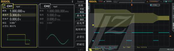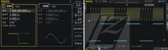 以下各图是调试波形测试图片, 左侧时信号源输出设置, 右侧是示波器观察到的调制波输出信号。