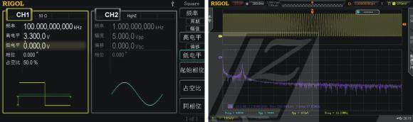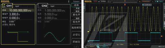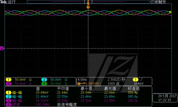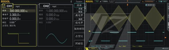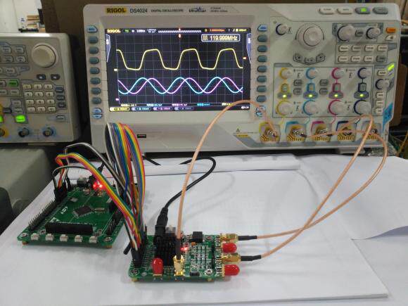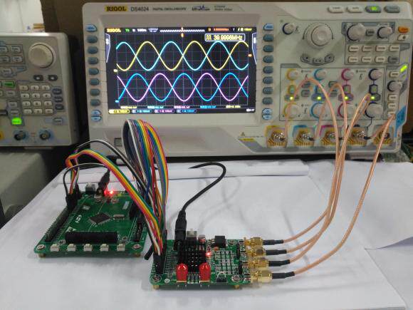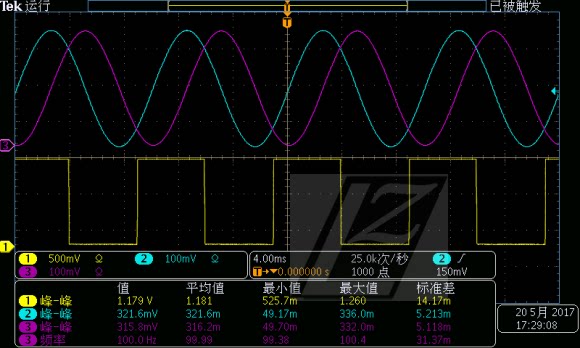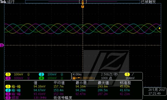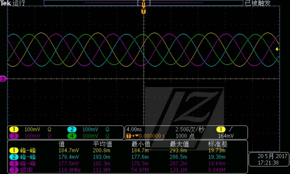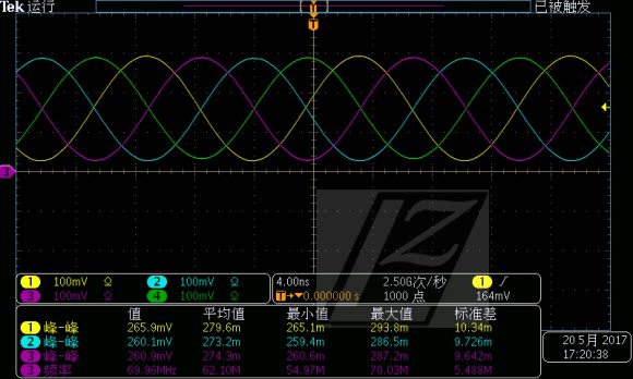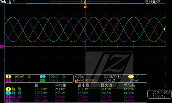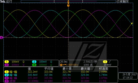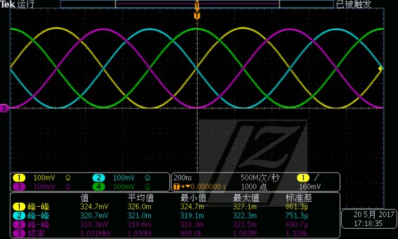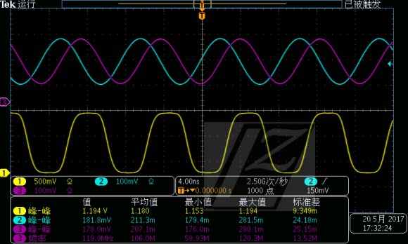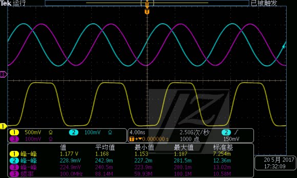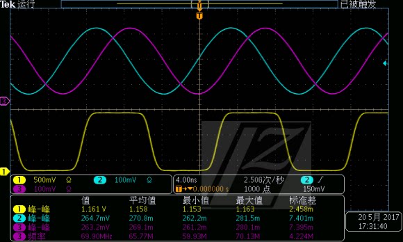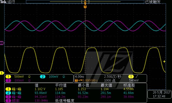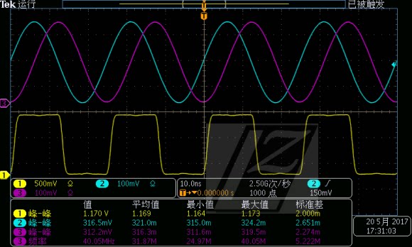 2、 方波测试波形图 (示波器输入50Ω模式, 图中正弦是另外两路正交信号)