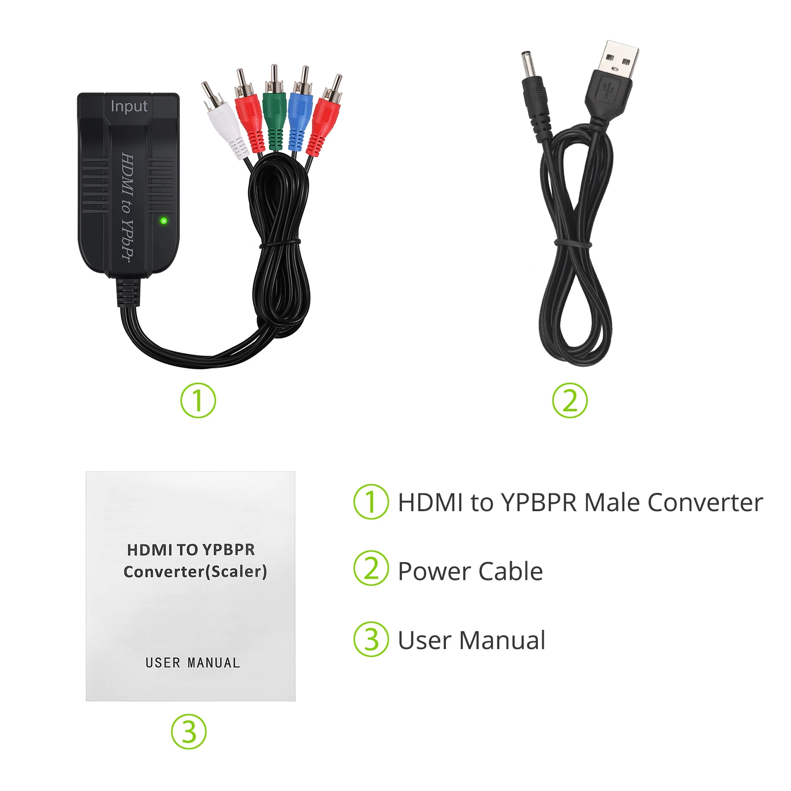 2. Этот элемент не имеет функции даунскейлера. Если ваше компонентное видеоустройство не поддерживает 720 или 1080, вам необходимо отрегулировать входной сигнал, совместимый с HDMI, до разрешения 480 или 576. Поскольку некоторые компонентные видеоустройства могут быть старыми, поддерживаются только форматы разрешения 480 или 576. И этот продукт является байпадом, что означает, что выходной сигнал зависит от входного сигнала.