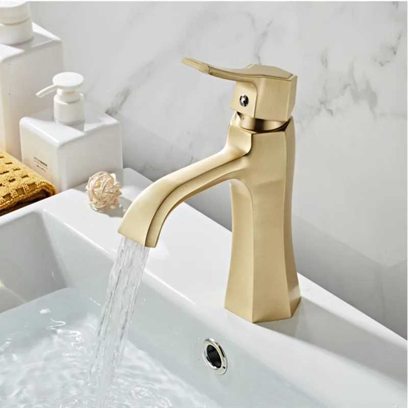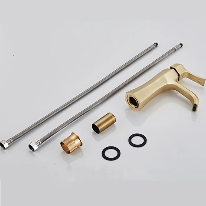 Описание продукта: Функция: кран для раковины в ванной комнате Материал: твердая латунь Отделка: матовый золотой С двумя трубами для горячей и холодной воды Количество ручек: 1 Специальные Особенности; Тихий близко, легко установить