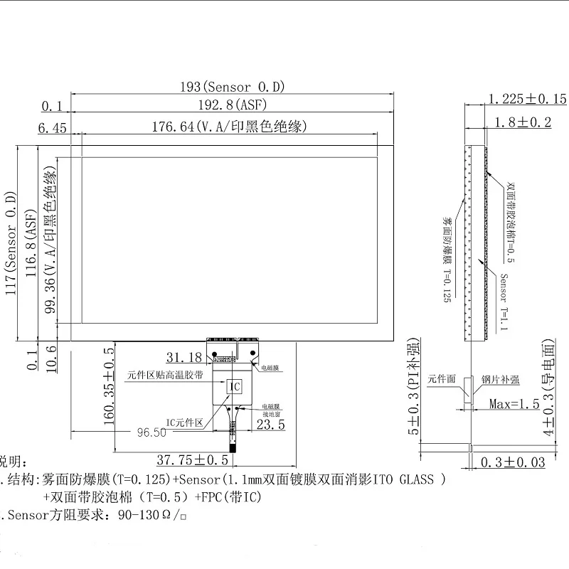 1. Структура: Взрывозащищенная мембранная (T = 0,125) + датчик скорости вращения (1,1 мм с двойным покрытием двухсторонняя тени ITO стеклянное) + двухсторонняя лента пены (T = 0,5) + FPC (с IC) 2. Требования к датчику сопротивления: 90-130 Ом/ 3. Электрические характеристики: IC принимает GT911, стандартный I2C интерфейс связи, рабочее напряжение 3,3 V, разрешение 1024*600 / 800X480 (X * Y). 4. Физические характеристики: коэффициент пропускания светильник ≥ 80% Рабочая среда: -30% DC ~ 70% DC среда хранения: -40% DC ~ 85% DC CG твердость поверхности ≥ 3H 5. Размер конструкции: (длина и ширина) 192*117 мм 6. 10-точечный сенсорный 6P интерфейса: IIC6P определение: 1.RST / 2.VCC / 3.GND / 4.INT / 5.SDA / 6. SCL