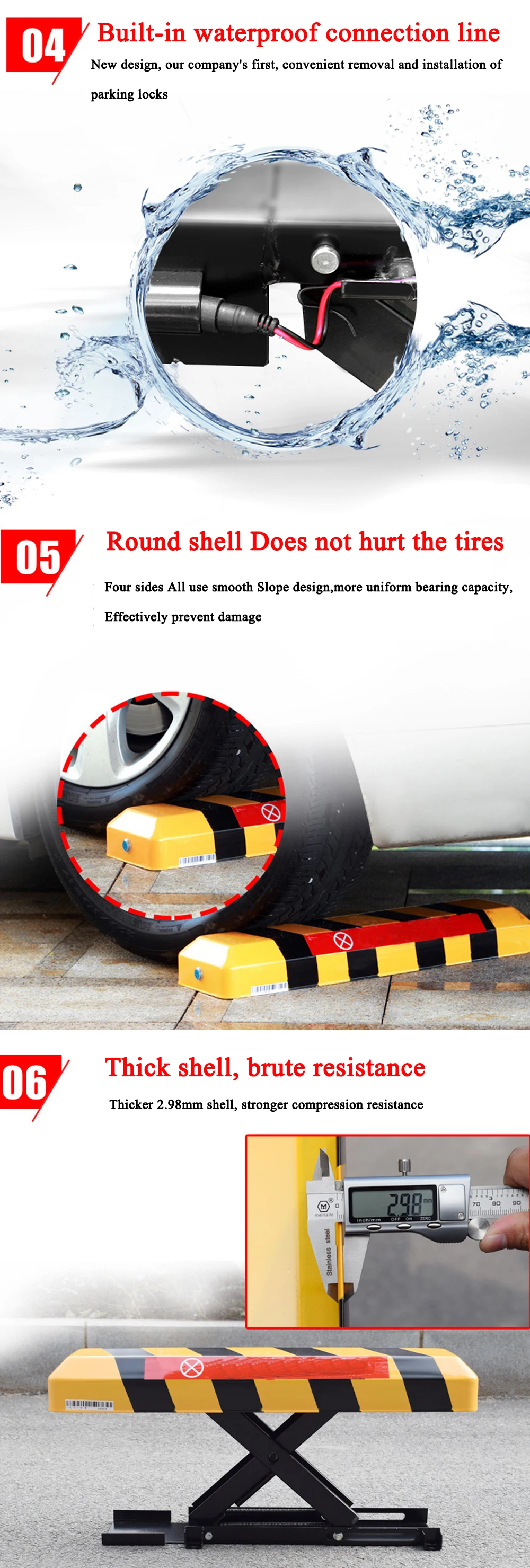 1. Модный дизайн: окрашенная поверхность, гладкая отделка; Рука в подъемном положении может быть 305 мм; 2. Сигнал тревоги для неавторизованной работы или наружной силы, пытающейся поставить руку вниз; 3. Водонепроницаемость: парковочный барьер хорошо работает, погружаясь в воду; 4. Защита от сползания: благодаря монтажным болтам внутри это невозможно; 5. Защита от давления: Чехол изготовлен из стали 3 мм, он прочный; 6. Мощность Индикатор состояния: в тех случаях, когда ток в режиме ожидания составляет менее 4,5 V, раздастся звуковой сигнал.