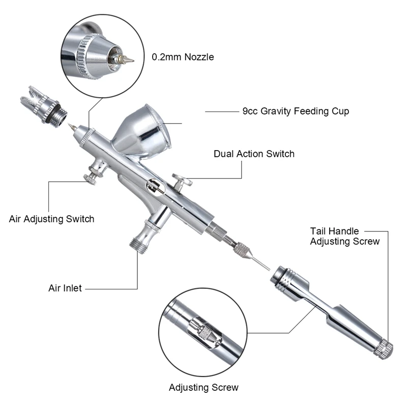 Технология двойного действия: контроль цвета и количества воздуха с помощью пальца диапазон применения: Аэрограф, модель, краска (автомобиль, велосипед, велосипед и т. Д. ), Аэрограф татуировки, дизайн ногтей и многое другое. 100% абсолютно новый и высококачественный. Двойной спусковой механизм управления воздушными красками. Легко обрабатывается. Светильник с литой матрицей для сильной мощности. Конструкция двойного действия позволяет пользователям определить количество воздуха и жидкости. Обеспечивает превосходное распыление и невероятное управление.
