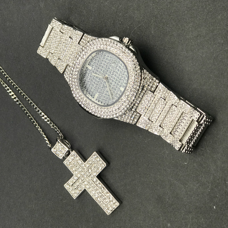 Часы: 100% Новый бренд Лабораторные алмазы камни на браслете Нержавеющая сталь сзади Позолоченный Часовой механизм: кварцевый (Япония) Батарея в комплекте. Чехол Размеры: 43 мм (Диаметр) Вес: 120 грамм Замок: с отворотом Пол: Для мужчин/'s Съемные звенья (регулируемые) Роскошный стильный чехол-накладка Упаковочный лист Часы-1 шт. 1 * Цепочки и ожерелья 1 * Подарочная коробка в комплекте