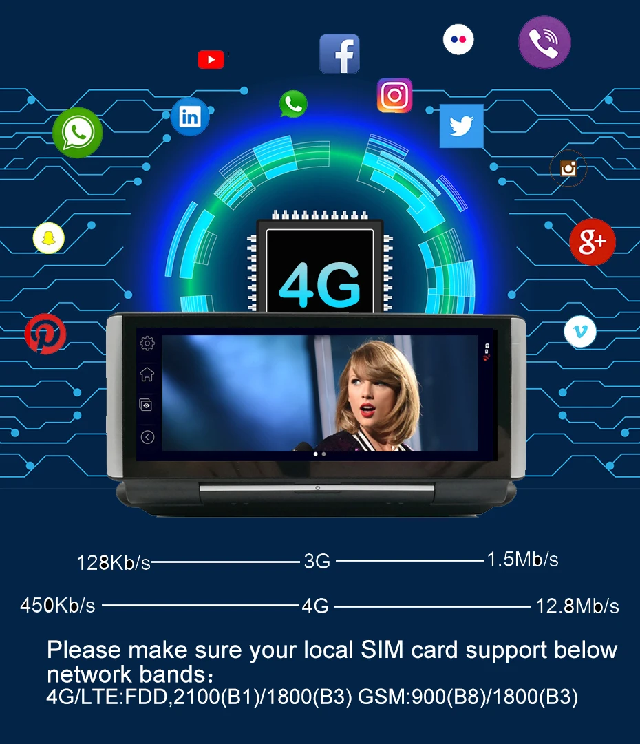 Благодаря sim-карте 4G и встроенному Wi-Fi, независимо от того, где вы едете, вы будете наслаждаться удовольствием от интернет-серфинга, что делает его возможным для онлайн-навигации/музыки/кино и т. Д.Примечания: перед размещением заказа, пожалуйста, проверьте, находится ли ваша локальная сеть sim-карт ниже полос или нет:(4G/LTE:FDD,2100(B1)/1800(B3) GSM:900(B8)/1800(B3)Бесплатные gps-навигационные карты