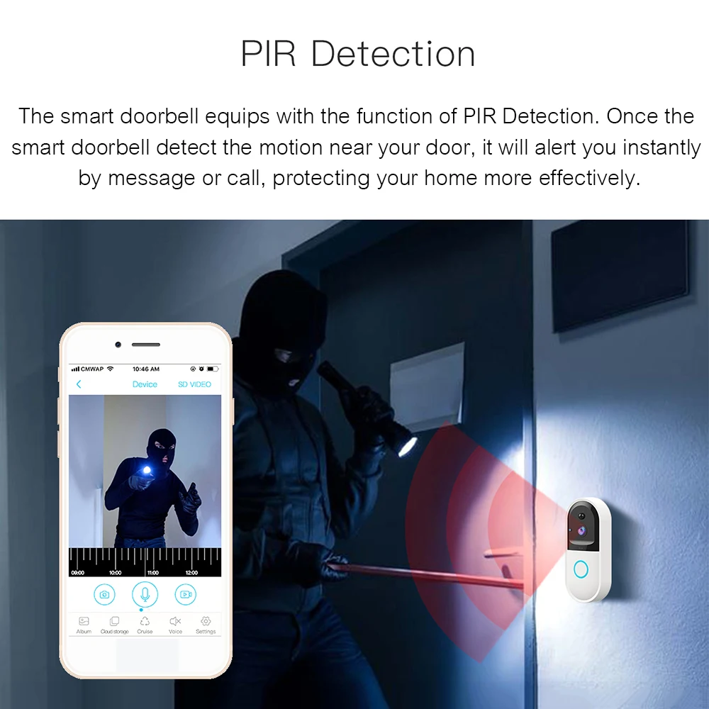 【Обнаружение движения PIR 】как только умный дверной звонок обнаружит движение, он предупредит вас немедленно по сообщению или звонку, более эффективно защищая ваш дом.