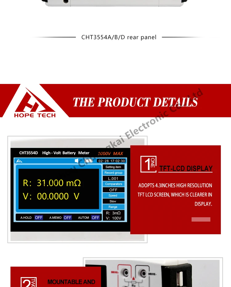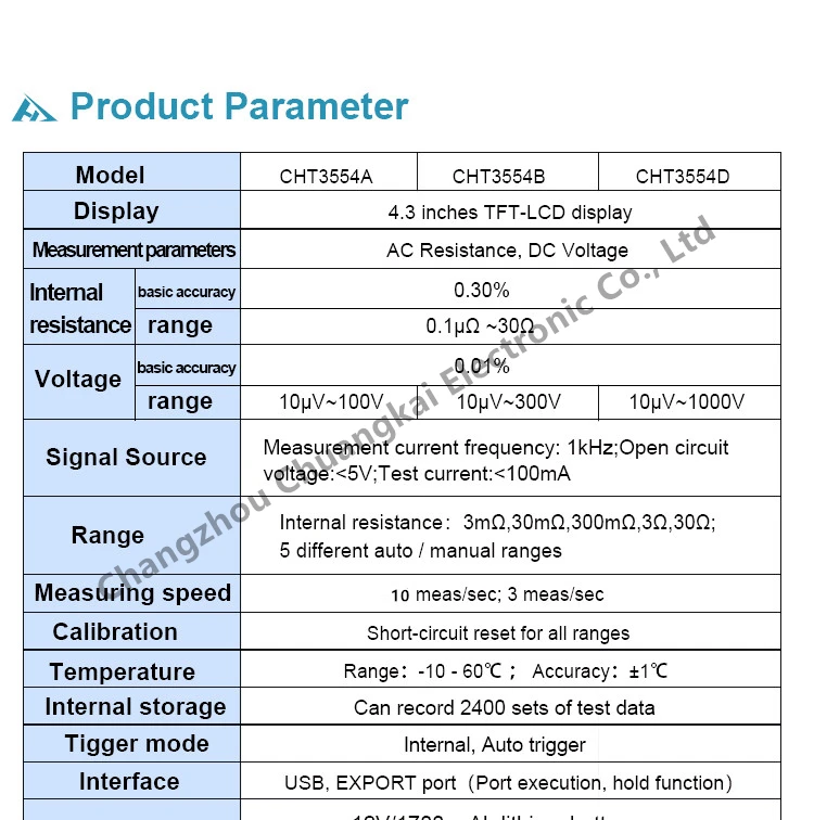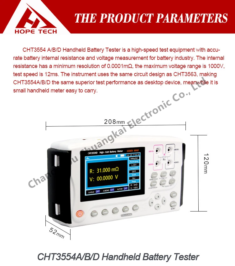 CHT3554A/B/D является прецизионным тестером для обычных батарей. Он сопоставим с точностью и скоростью настольных инструментов среди портативных устройств, в то время как он легче и меньше, чем настольные инструменты.